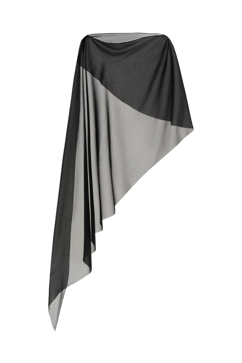 Cette élégante cape se drape délicatement, ajoutant une touche de sophistication à n'importe quel look. Confectionné en mousseline de soie de qualité supérieure, il présente un design asymétrique et un tissu transparent, créant une sensation d'allure et d'opulence. Élevez votre style avec cet accessoire exclusif.