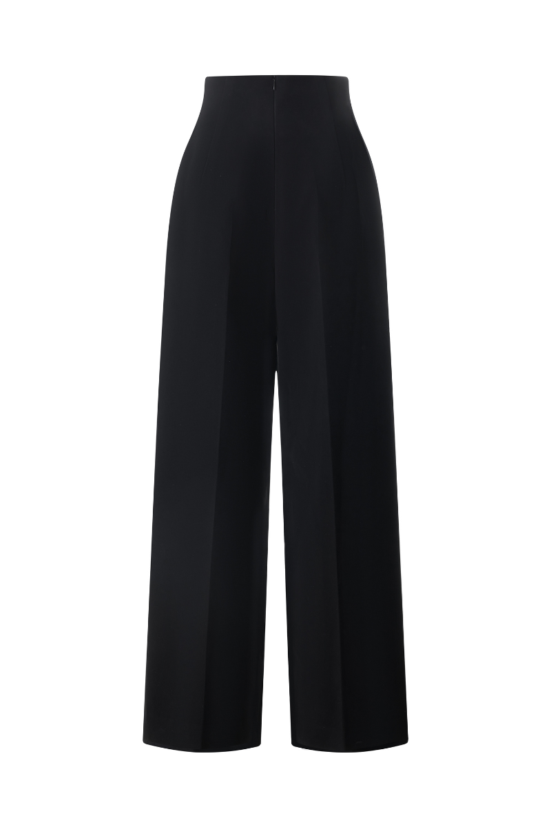 Ce pantalon taille haute à jambes larges est confectionné dans un tissu noir structuré qui s'harmonise parfaitement avec le haut. Son design épuré et minimaliste, avec ses plis marqués sur le devant de chaque jambe, lui confère une touche de sophistication. Sa silhouette longue et fluide allonge la silhouette, tandis que sa coupe généreuse lui permet de tomber élégamment jusqu'au sol. Sa sobriété contraste avec le haut spectaculaire, conférant à l'ensemble une simplicité raffinée.