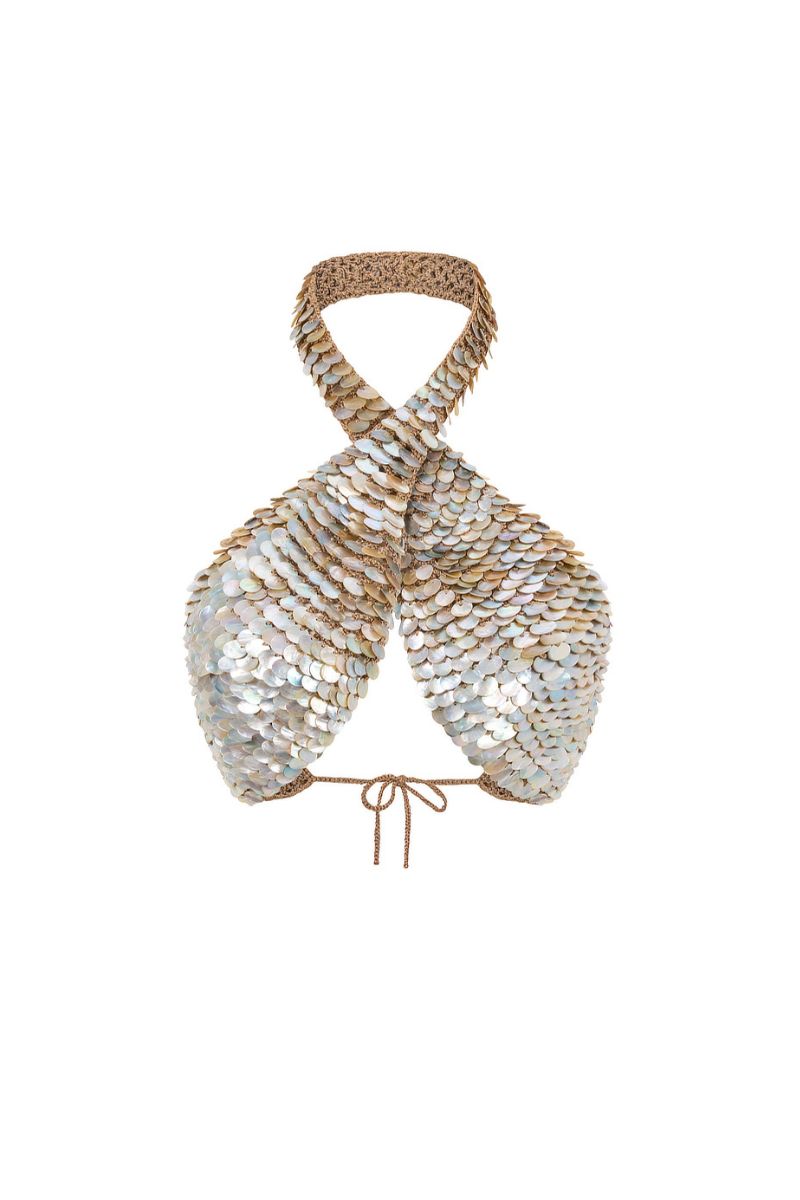 haut croisé orné de perles, crocheté à la main, couleur bronze