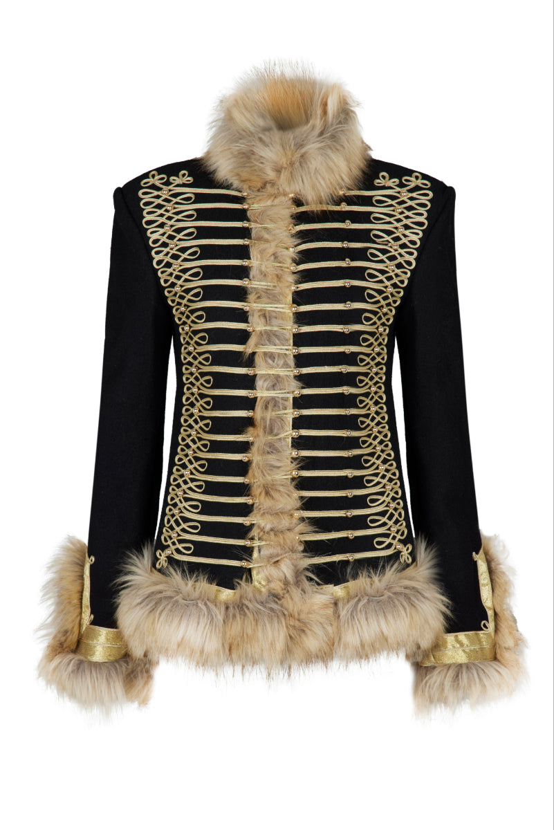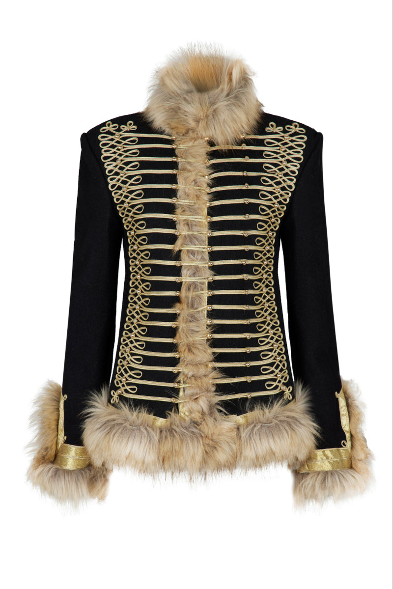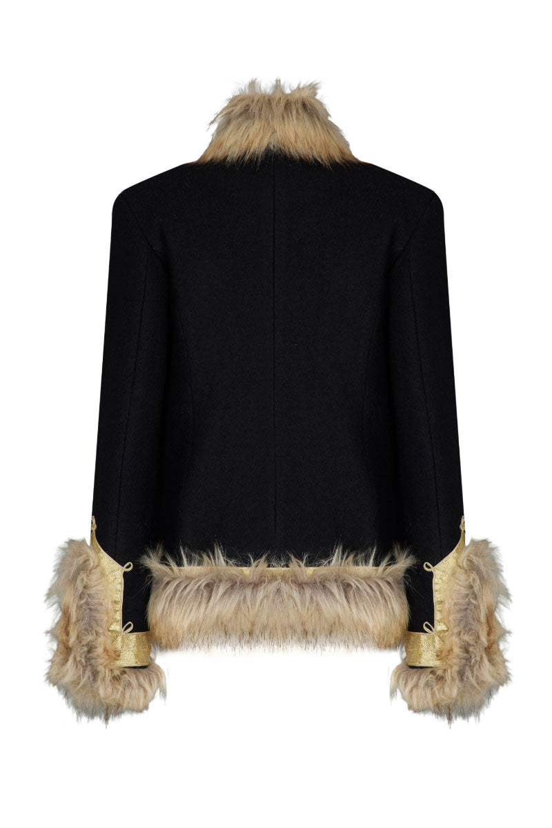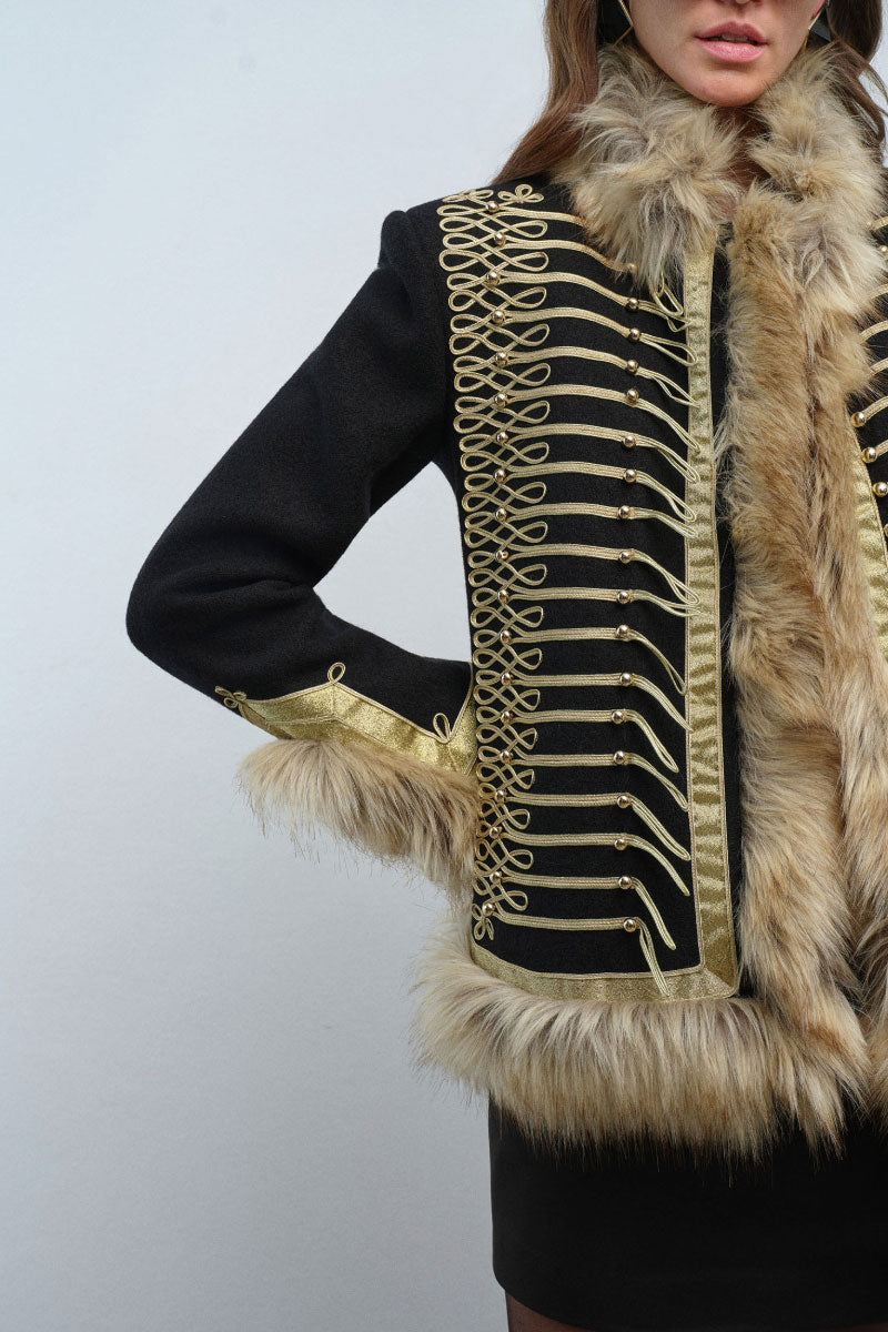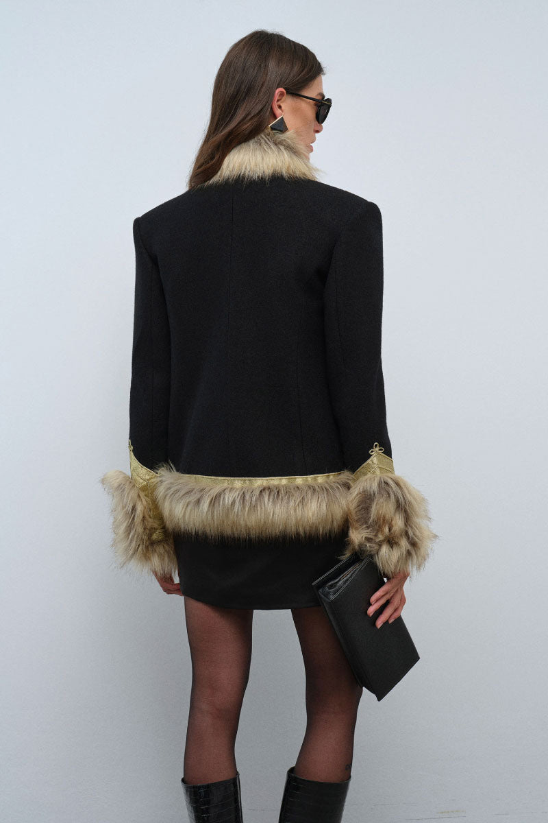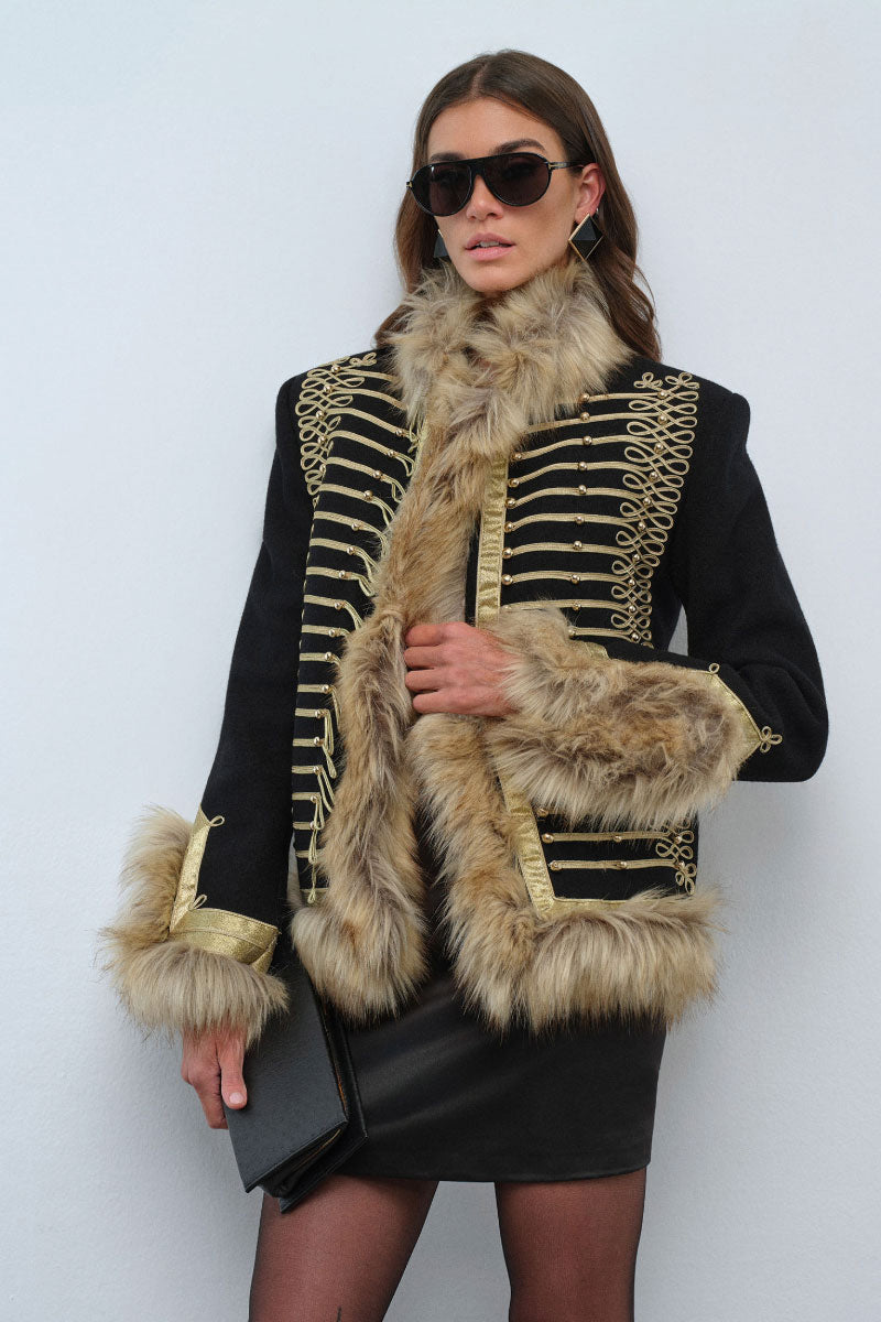 La veste Calla est audacieuse, luxueuse et pleine de caractère. Confectionnée en tissu noir structuré, elle arbore un tressage doré complexe d'inspiration militaire sur le devant, créant une silhouette affirmée et raffinée. Une riche fausse fourrure orne le col, les poignets et l'ourlet, apportant chaleur et texture spectaculaire. De plus, sa doublure intérieure matelassée offre un confort et une isolation accrus, la rendant aussi pratique qu'élégante. Sa coupe cintrée met en valeur les épaules et souligne la taille, conférant à la veste une silhouette féminine et puissante. Portez-la sur une mini-robe pour une allure sophistiquée en soirée, ou associez-la à un pantalon tailleur pour une tenue de jour affirmée. La veste Calla devient ainsi la pièce maîtresse de toute garde-robe : un modèle affirmé, intemporel et indéniablement signé Nana Gotti.