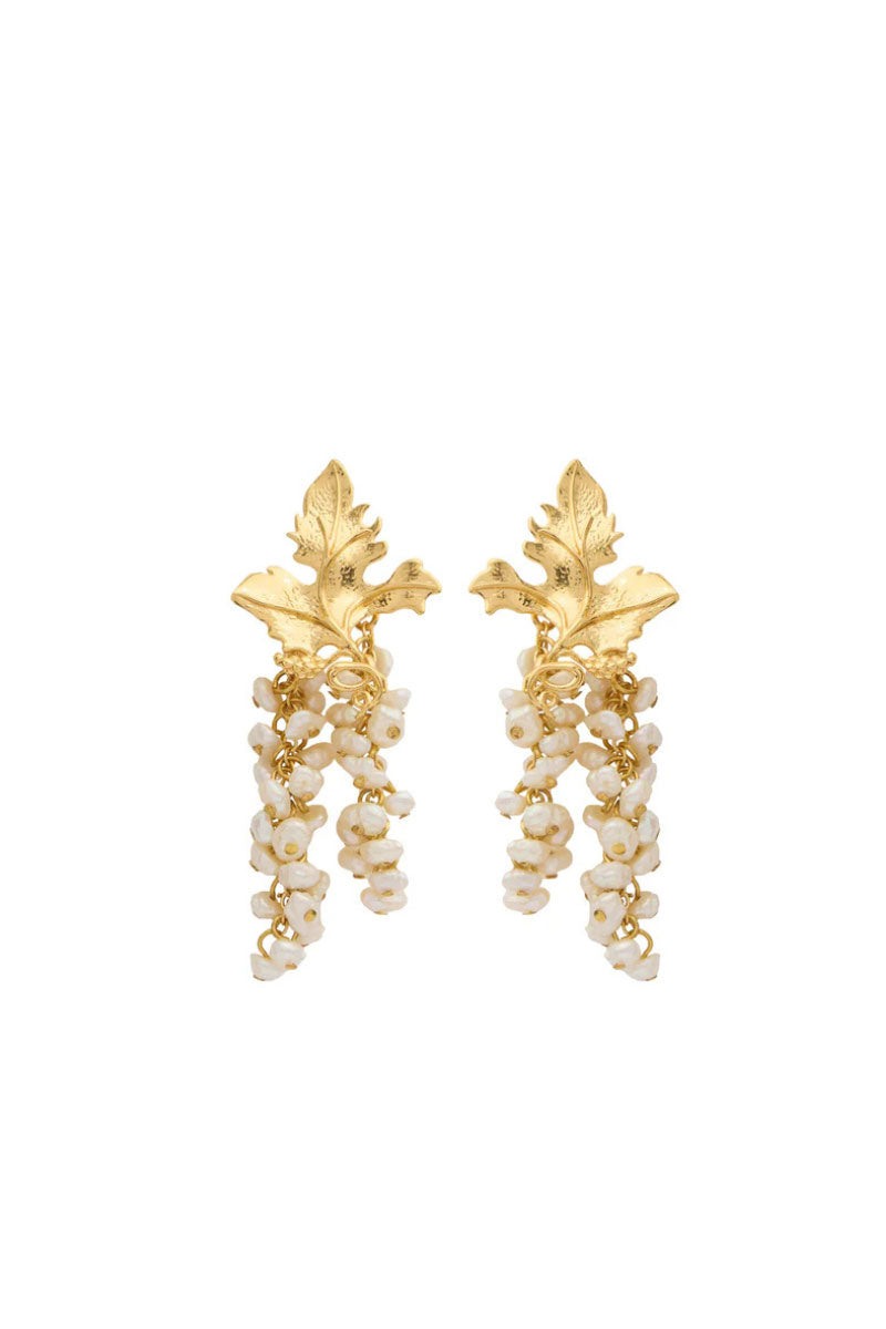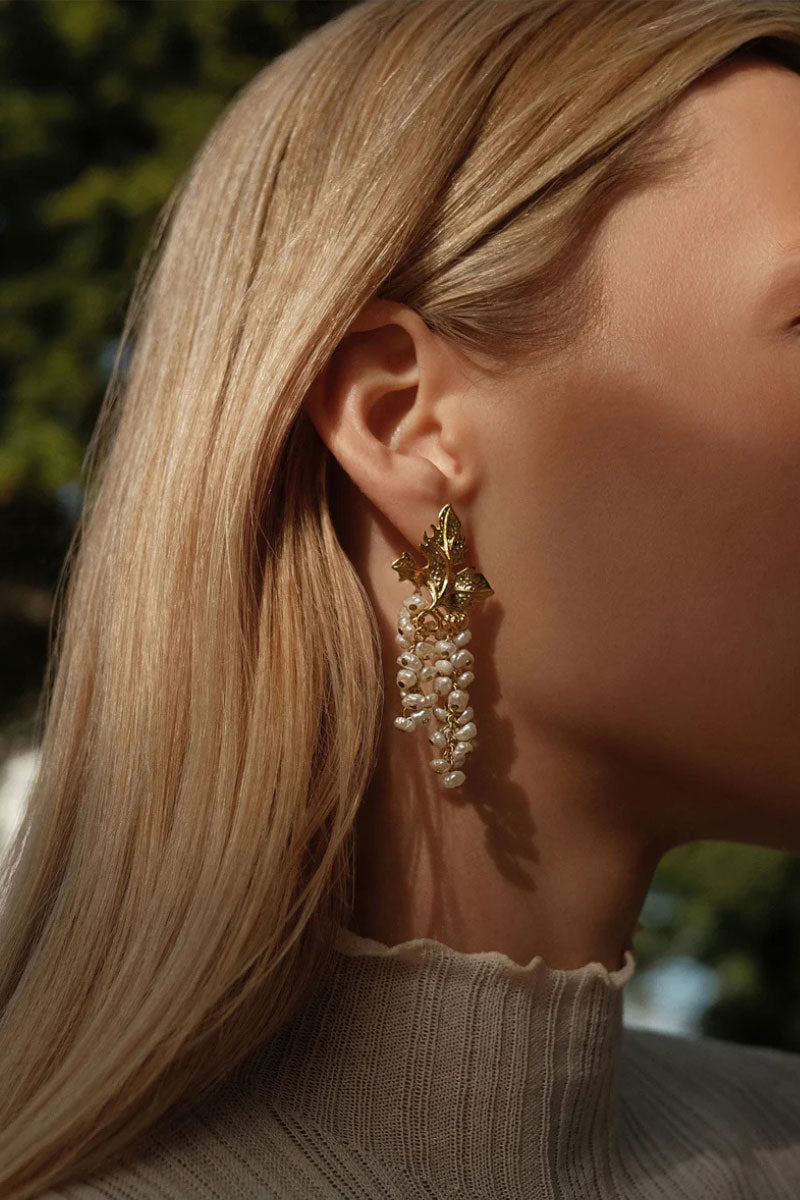 Avec ses formes organiques et ses nervures complexes, ce bijou s'inspire des feuilles de vigne. Fabriqué artisanalement en bronze plaqué or 24 carats, il est orné de véritables perles baroques et se ferme par une épingle.