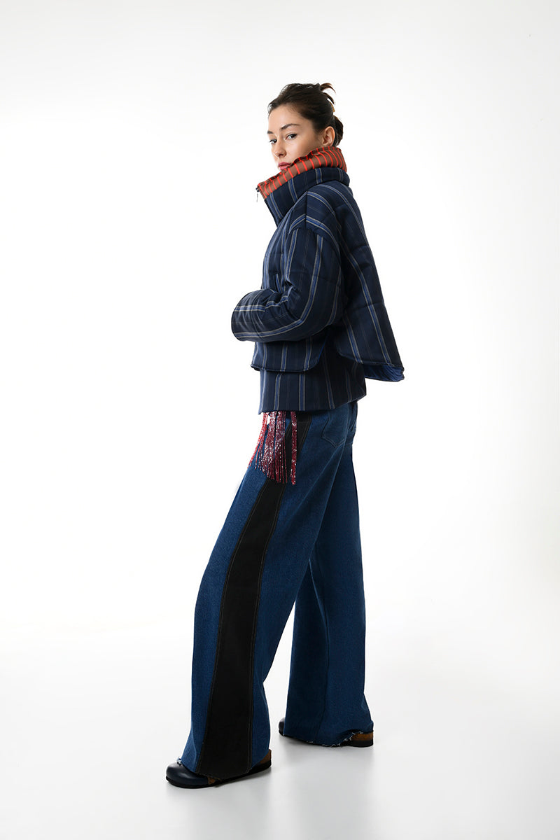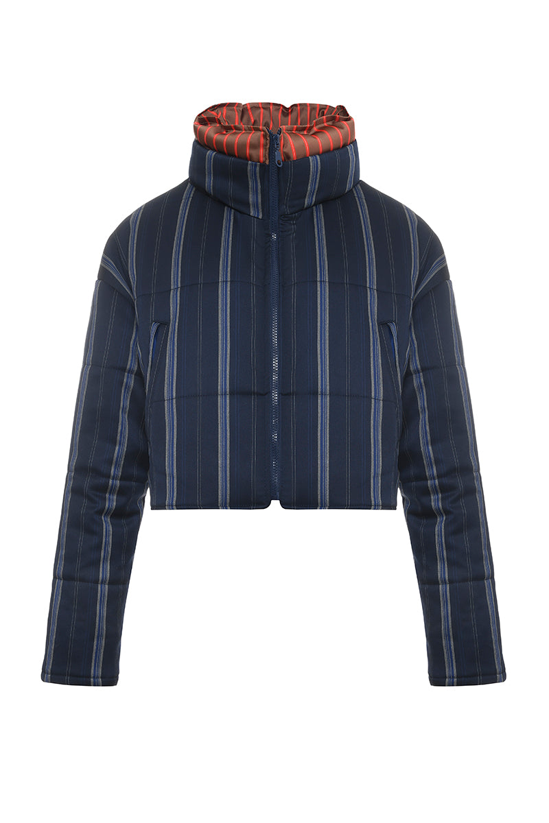 - Motif à rayures verticales bleu marine, bleu et argent mat