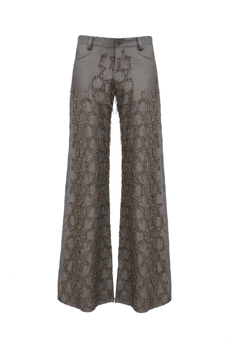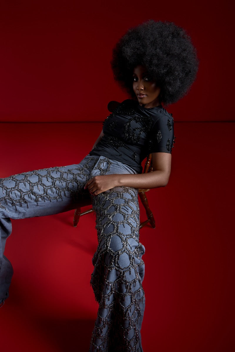 - Perles en nid d'abeille appliquées à la main : Offre une apparence texturée unique qui rehausse le denim classique.