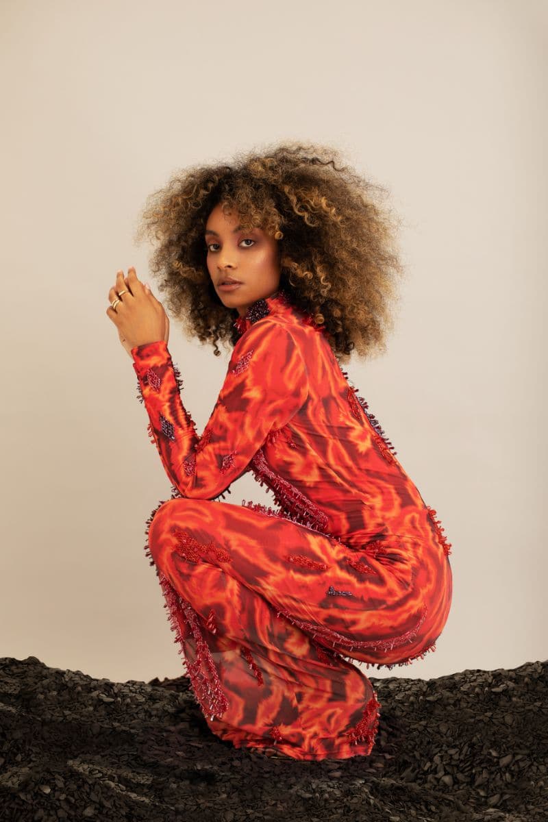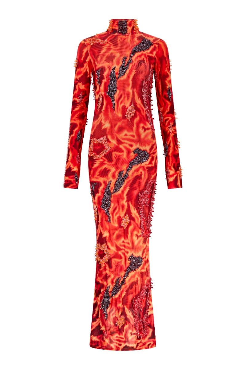 Répondez à vos envies de mode avec cette robe à imprimé abstrait, dotée d'un col haut et d'une silhouette moulante. La robe est entièrement doublée d'une fermeture éclair invisible au dos, tandis que les perles 3D ajoutent une touche de sophistication.