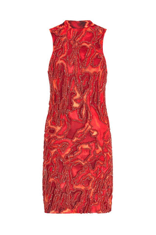 Cette robe présente un superbe motif abstrait en cristal, mettant en valeur son attrait luxueux. Avec une longueur mini élégante et une coupe sans manches, il présente une silhouette ajustée entièrement doublée pour une finition impeccable. La fermeture éclair invisible au dos ajoute une touche d'élégance à cette pièce exquise.