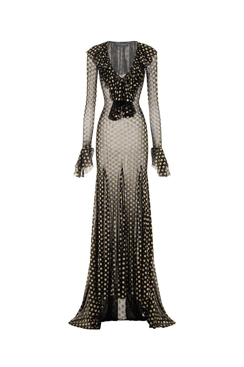 Une robe noire transparente ornée de pois dorés métallisés, à la coupe longue et fluide. Son décolleté en V plongeant est souligné de délicats volants, apportant une touche à la fois audacieuse et féminine.
