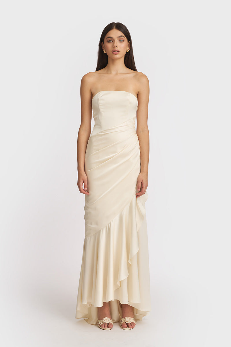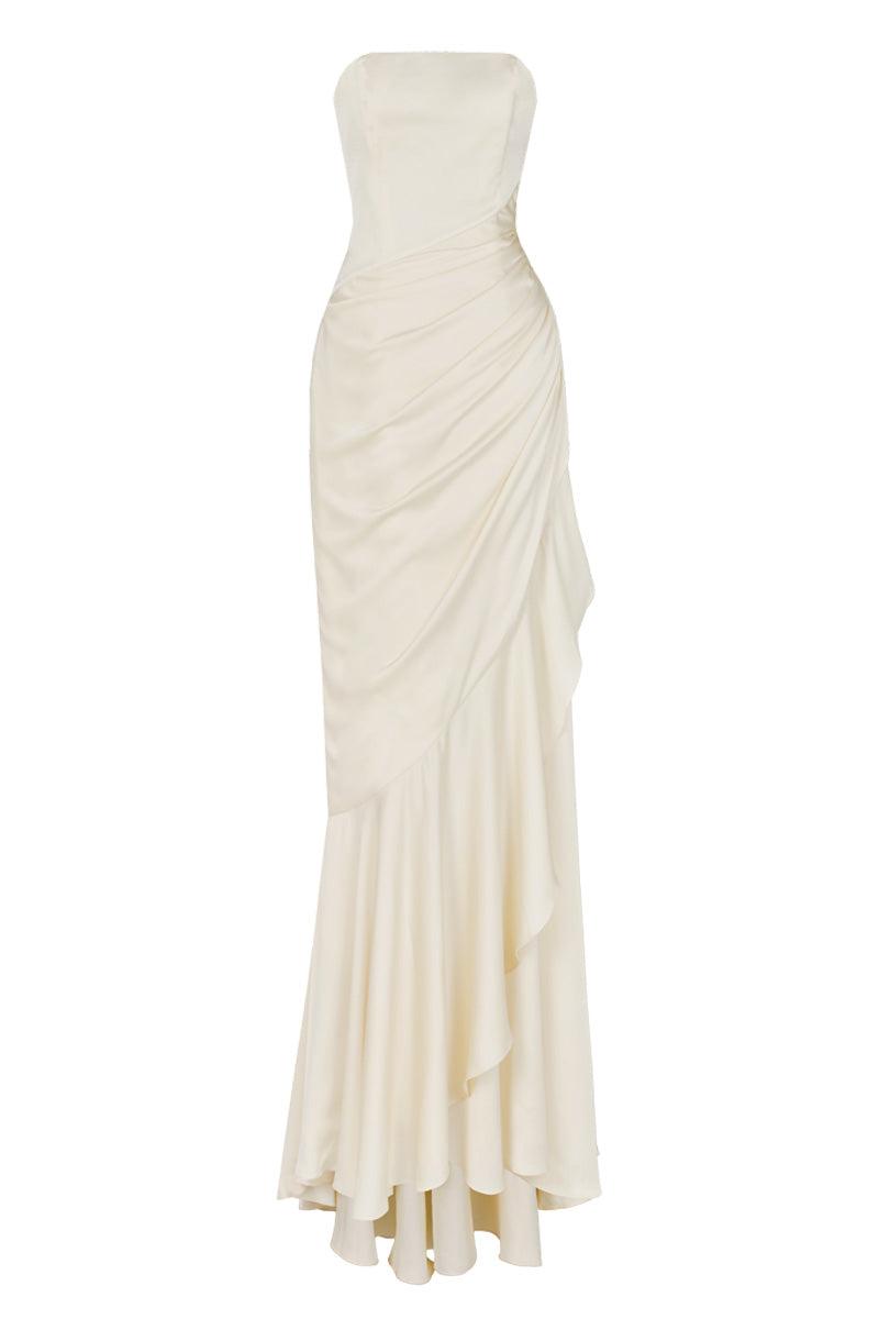 Robe bustier luxueuse d'inspiration vintage avec fermeture à glissière dissimulée et confectionnée en satin de soie de qualité supérieure. Cette élégante robe bustier est doublée et coupée en biais, avec des détails délicats de fronces et de fronces. La silhouette drapée comprend un corsage bustier ajusté et est fabriquée à la main en Thaïlande.