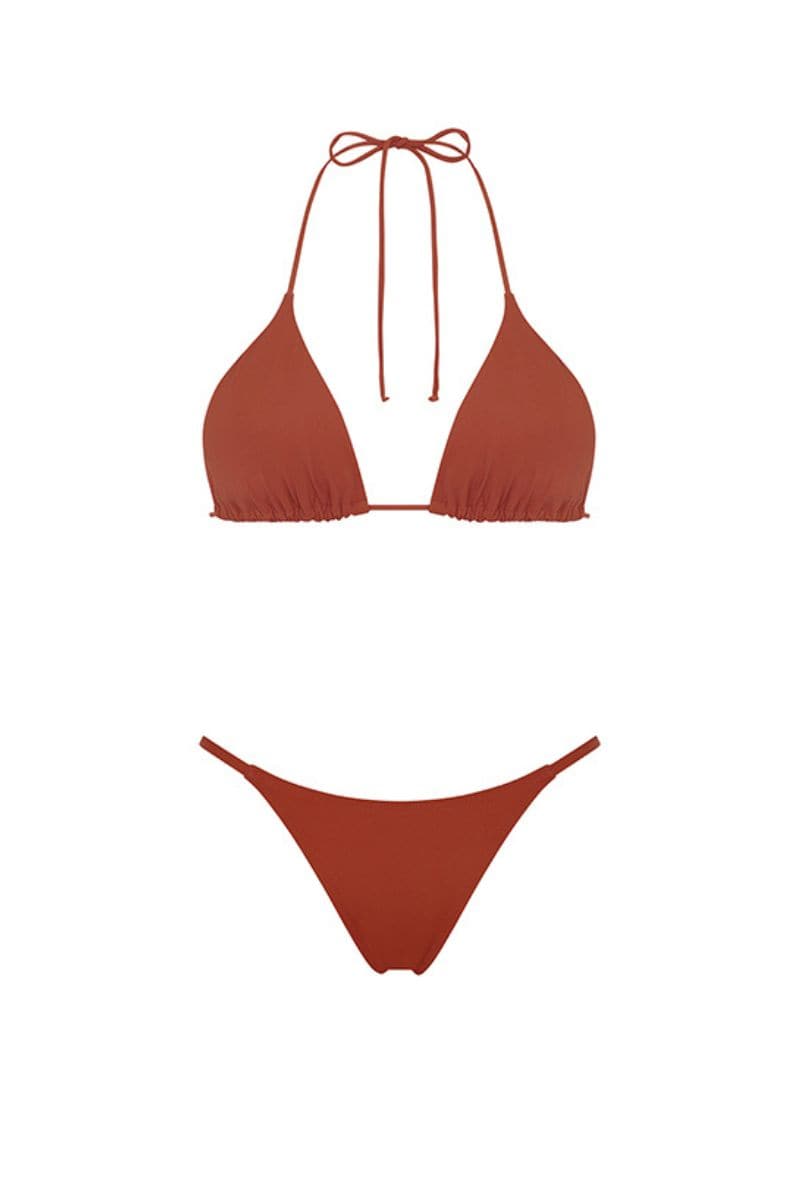 Le haut triangle coulissant Provence et le bas à nouer sur les côtés dans cette couleur Ocre originale exclusive à Aguaclara. Un haut et un bas de bikini en tissu italien doté de bretelles à nouer avec des ficelles en métal doré aux extrémités de notre collection Swim 2014.