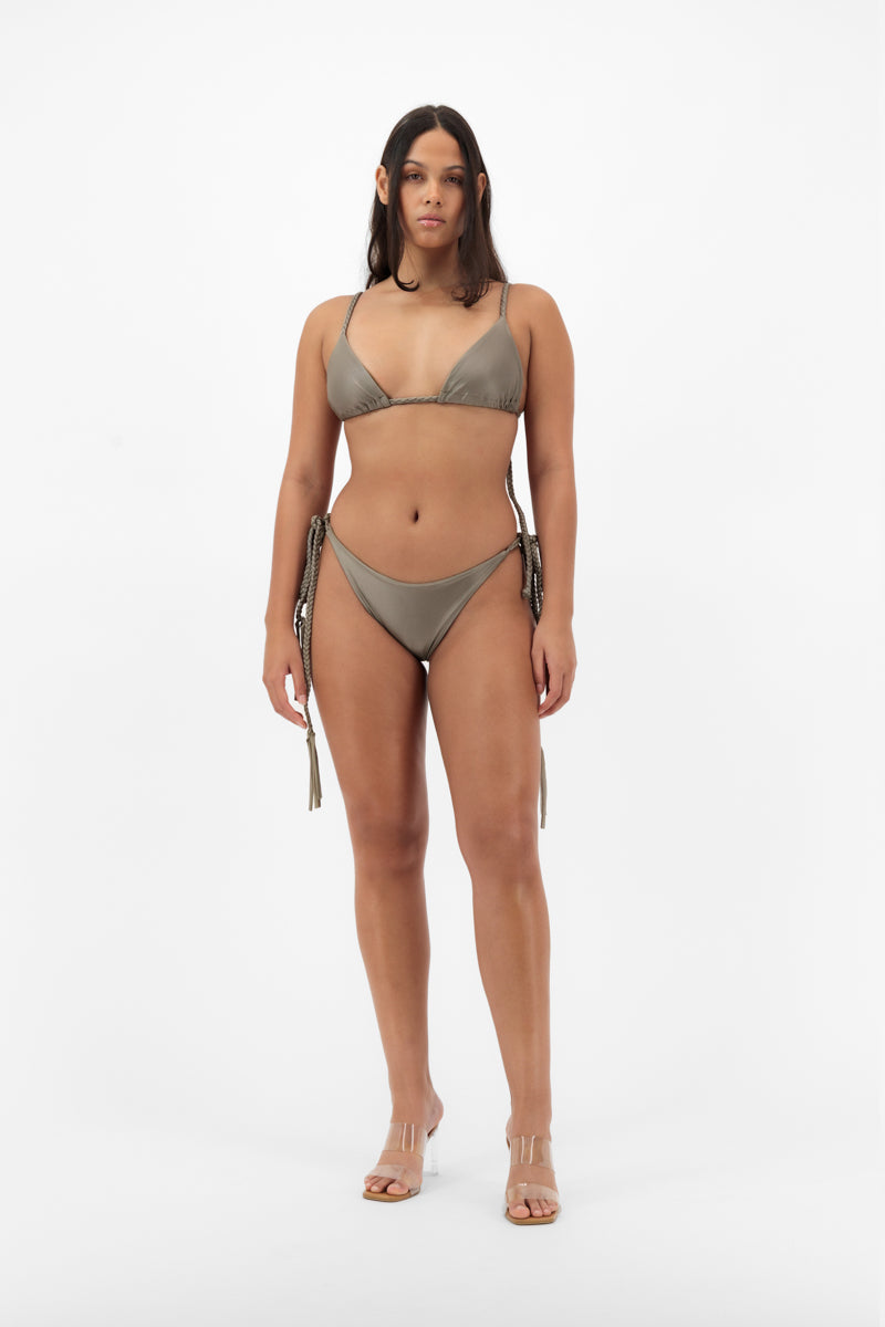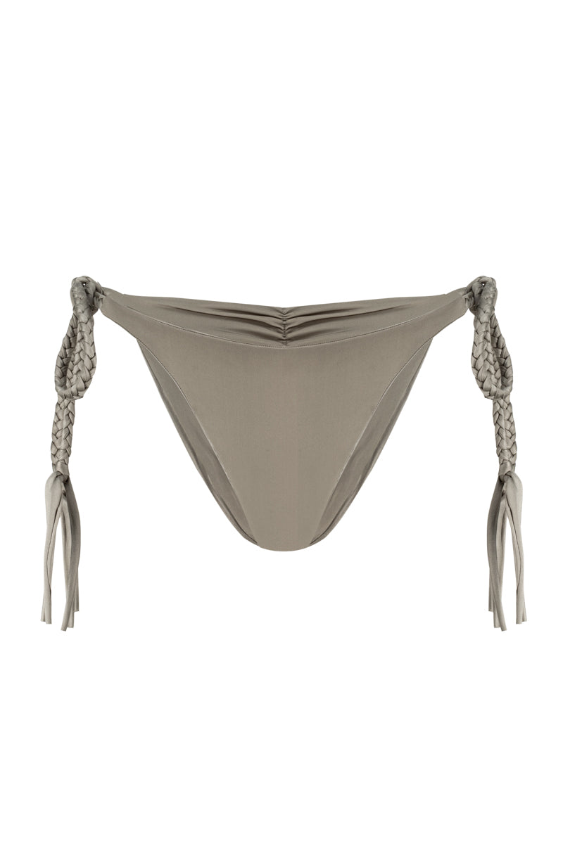 - Taille basse, avec attaches latérales en corde tressée pour un ajustement personnalisé
