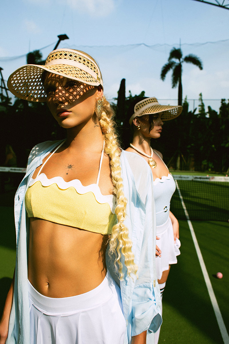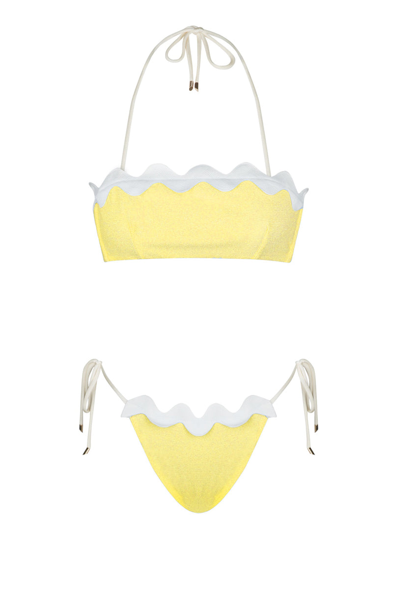 Le bikini deux pièces TROPICA apporte une touche d'originalité à la collection TROPICA d'Aanoukis : le détail ondulé de l'ourlet, tant sur le haut que sur la culotte. Décliné dans une douce teinte jaune mimosa en éponge, ce bikini offre un look à la fois ludique et élégant, idéal pour une baignade rafraîchissante et des moments de détente à la plage sous le soleil.