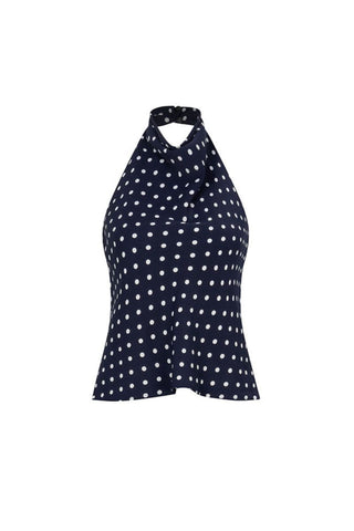 Un haut dos nu à pois, dos nu et col montant élégant, pour une silhouette moderne et affirmée. Sa coupe fluide épouse les formes avec grâce, mêlant charme espiègle et élégance intemporelle.