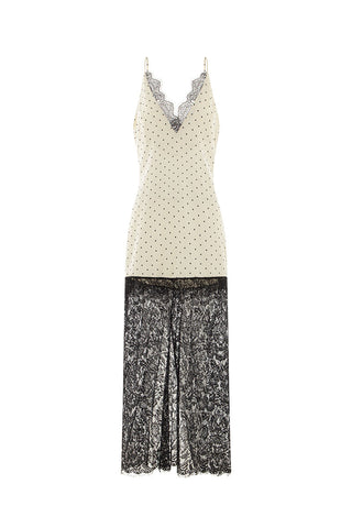 Une élégante robe nuisette courte à pois fins et discrets. Elle est dotée de fines bretelles spaghetti et d'un décolleté en V flatteur, délicatement orné d'une bordure en dentelle noire contrastante. Sous la nuisette se cache une jupe longue spectaculaire, entièrement réalisée en dentelle florale noire, offrant un contraste aérien et transparent avec le haut opaque.
