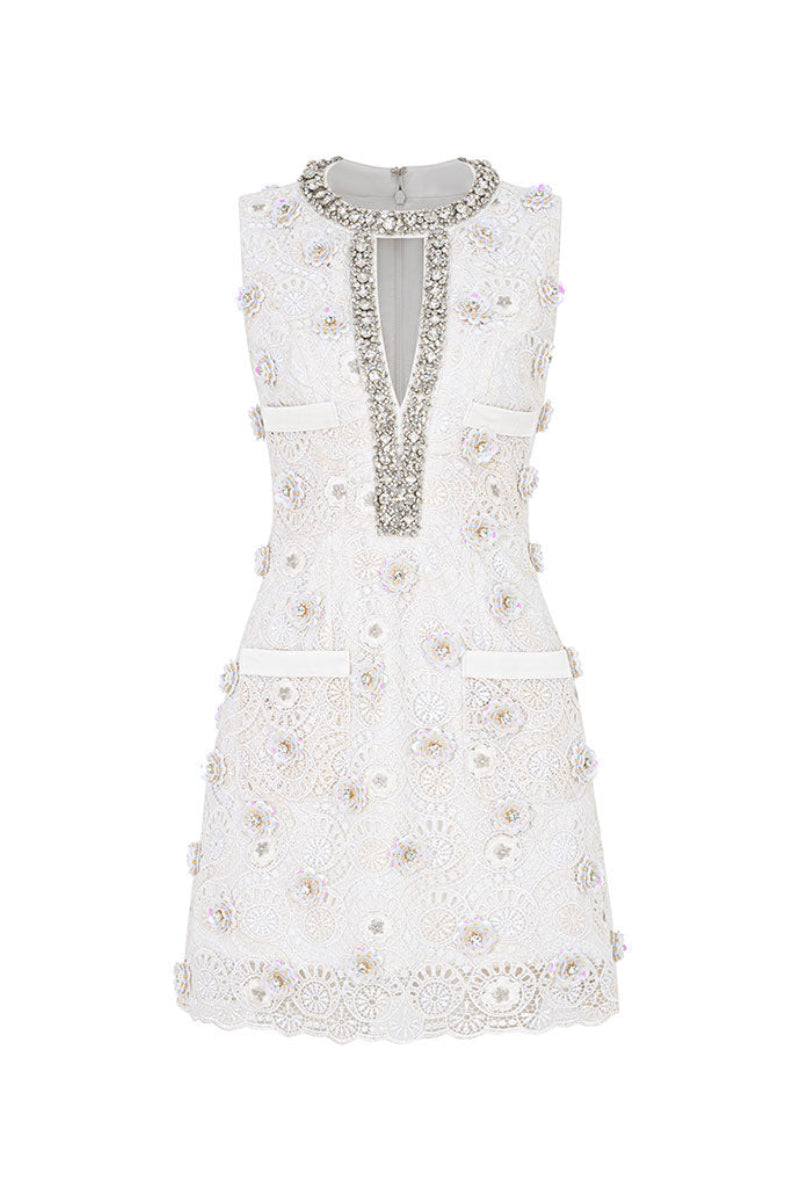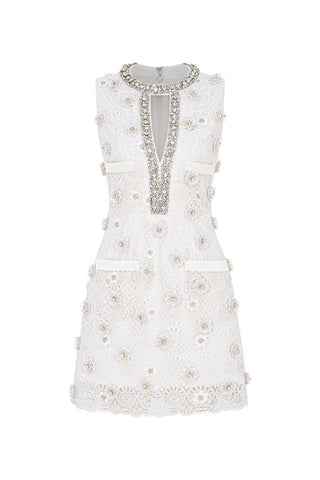 Cette exquise robe courte présente une silhouette droite et structurée, offrant une coupe chic et ajustée. Confectionnée en dentelle délicate, elle est richement ornée d'appliqués floraux en relief et de perles fines. Son col montant raffiné, orné d'une élégante découpe en forme de goutte, et son absence de manches en font une pièce maîtresse remarquable.