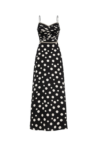 Cette robe présente de fines bretelles spaghetti et un décolleté en cœur, élégamment orné de plis contrastants. Une bande discrète en argent ou en cristal souligne la taille haute et le décolleté, apportant une touche d'éclat. La robe, fluide et gracieuse, effleure le sol, idéale pour une soirée chic ou un cocktail.