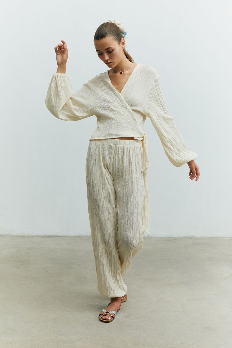 Pantalon luxueux fabriqué en Turquie, doté d'une taille et de chevilles élastiques pour un port confortable.
