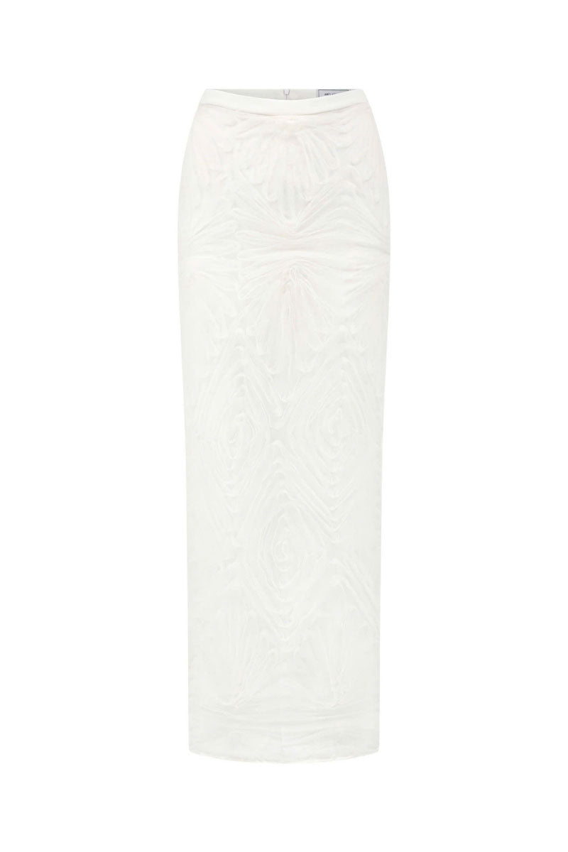 Jupe crayon en tulle, délicatement ornée d'appliqués raffinés et doublée de habutai lisse. Sa coupe ajustée met en valeur la silhouette et lui confère une élégance sophistiquée. Idéale pour les occasions professionnelles, les réunions d'affaires et les événements formels.