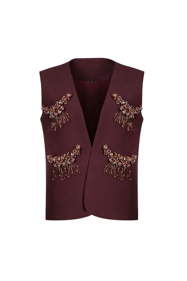 Un gilet sans manches marron sur mesure, orné de quatre élégantes broderies de cristaux et de perles. Avec sa silhouette structurée et son décolleté en V épuré, ce gilet allie raffinement et sophistication avec une touche d'éclat. Parfait à superposer sur un chemisier élégant ou à porter seul pour un look audacieux et tendance.