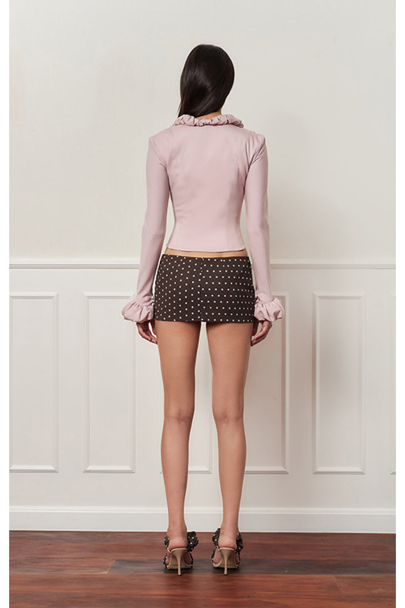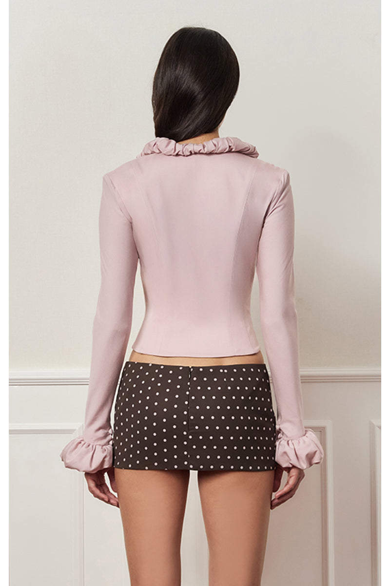 - Col et poignets emblématiques en forme de croissant, formés par des plis superposés