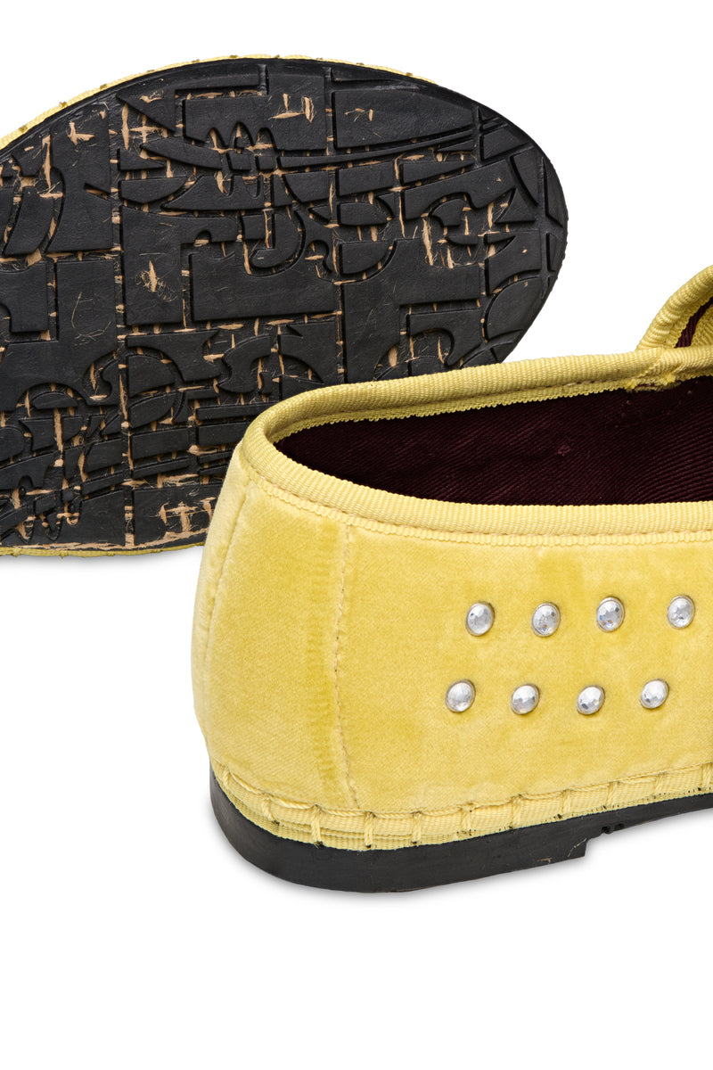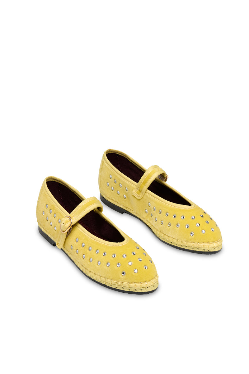 - Robe ballerine en velours jaune avec décolleté en V.