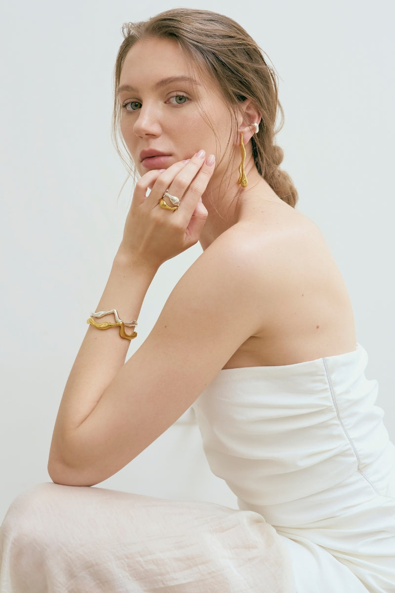 Ce bracelet manchette à la forme irrégulière et fondue est fabriqué à la main en Colombie. Parfait pour un usage quotidien et à associer à d'autres bracelets.