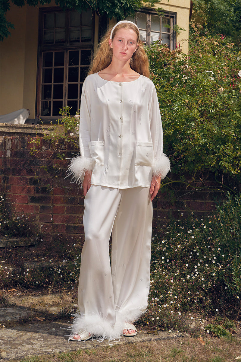 Des boutons en forme d'étoile créent un effet visuel saisissant. Des broderies rehaussées de détails en forme de losange forment un point focal empreint de savoir-faire artisanal. Des plumes amovibles ajoutent une touche romantique, tandis que les poches plaquées latérales allient praticité et élégance.