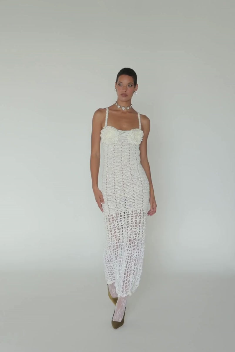 Robe blanche en crochet fait main avec dos ouvert, encolure ronde et détails en tricot fait main ornés de perles. Cette robe féminine est parfaite pour une occasion spéciale.