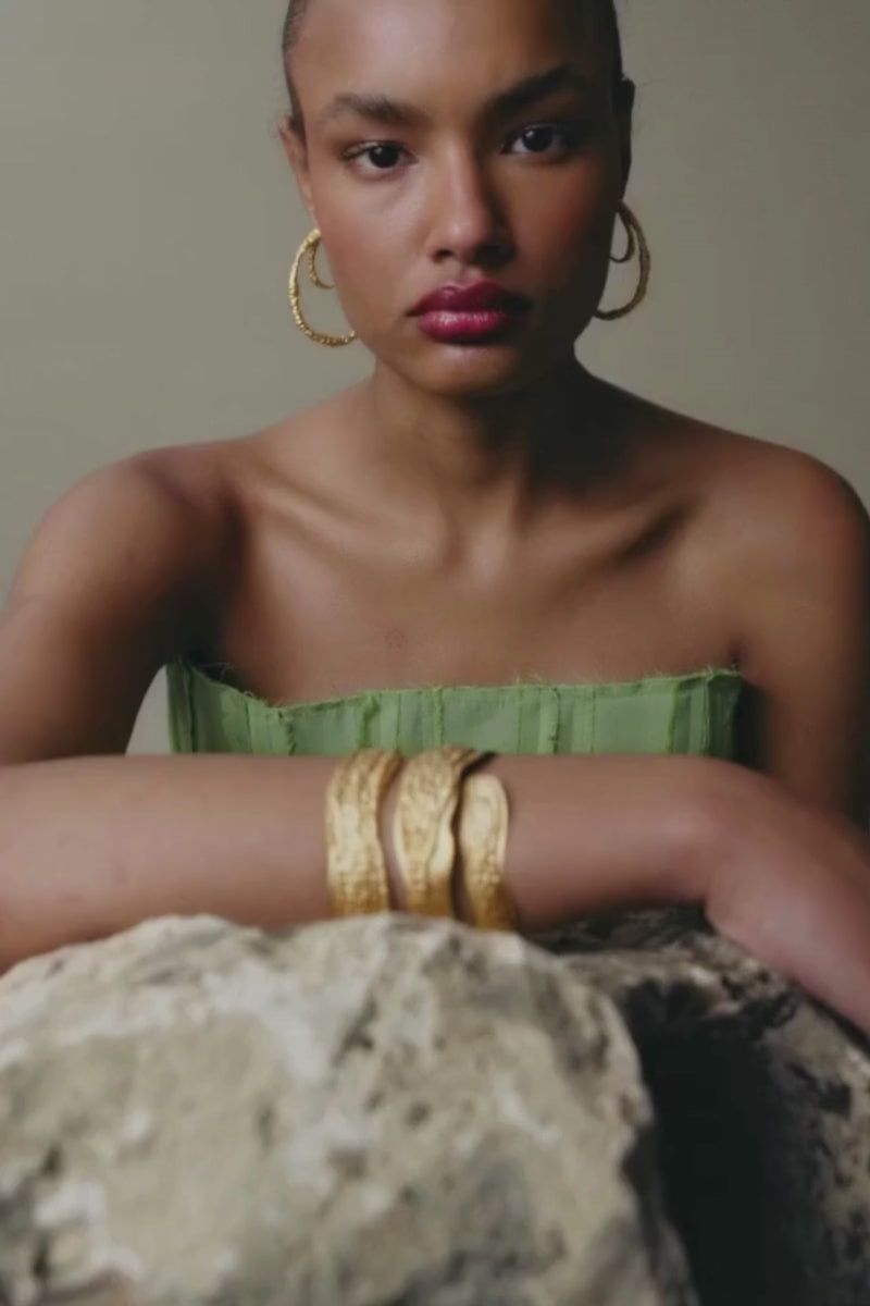 Le bracelet Shoreline est composé de trois rangées de « rivages » superposés qui serpentent et s'enroulent autour du poignet. Chaque rivage est constitué d'une couche de laiton plaqué or lisse surmontée d'une couche de texture fondue s'étalant sur la base, inversant la douceur de l'eau avec la rugosité du sable. Extrémité ouverte pour un réglage aisé.