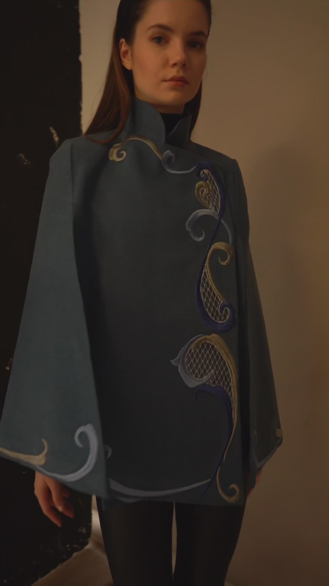 Cape en denim structurée Confectionnée avec des crochets dissimulés et invisibles et un col haut.