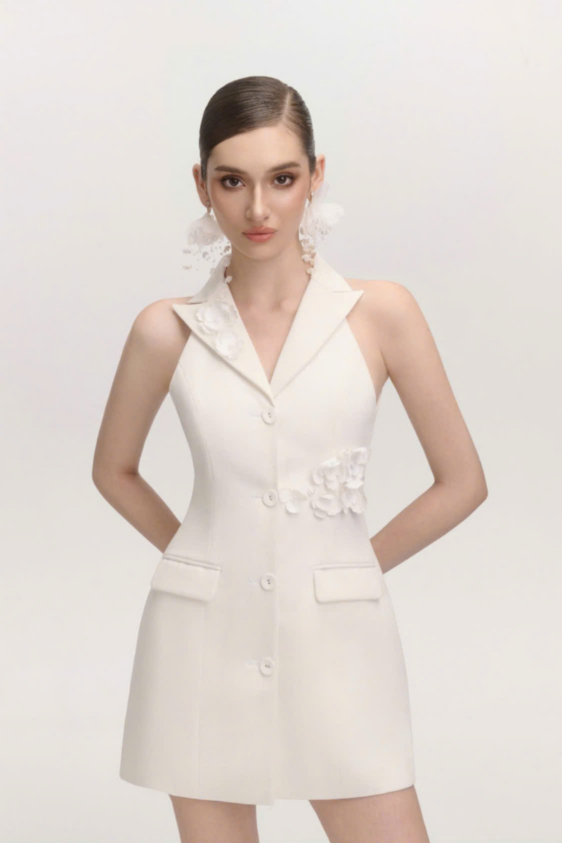 - Un ensemble polyvalent composé d'une robe ajustée et d'une veste courte. Le col à double revers est délicatement orné de détails floraux faits main, apportant une touche à la fois douce et raffinée.