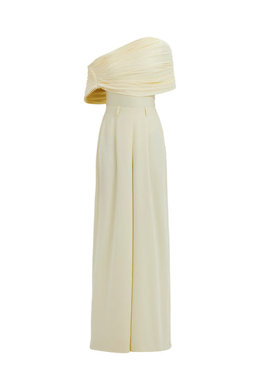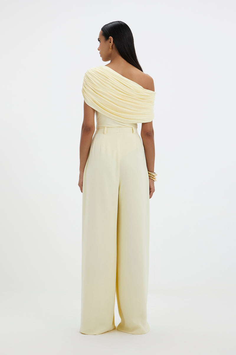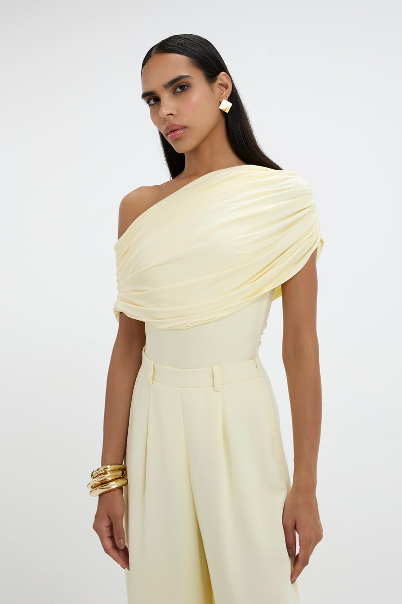 - Un body asymétrique drapé avec des plis souples