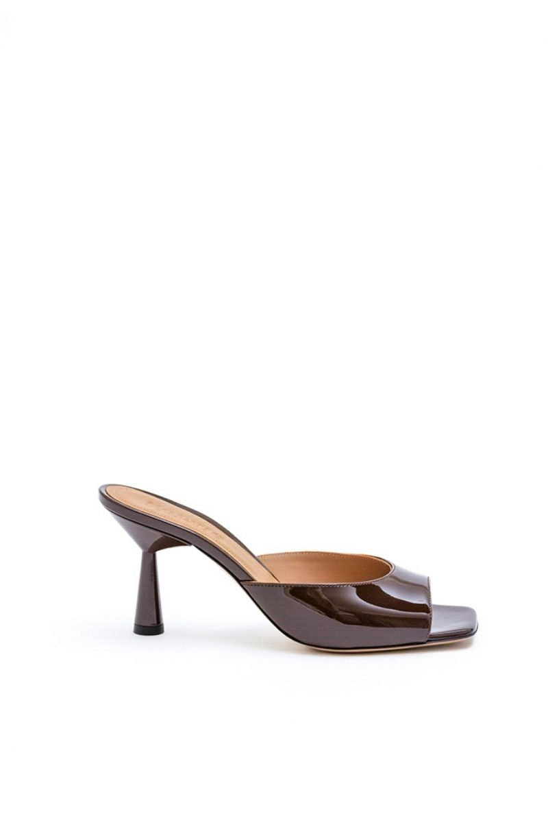 La mule Greta allie élégance classique et talon sculptural moderne. Confectionnée en cuir verni brillant d'un riche marron chocolat, elle présente une tige basse sur un talon carré confortable de 70 mm. Portez-la avec un jean pour une allure décontractée et décontractée, ou avec une tenue monochrome pour un style raffiné.