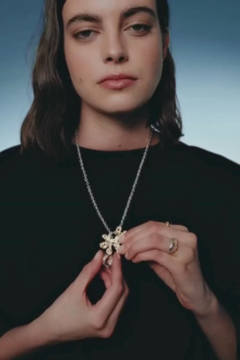 Collier en chaîne de galets argentés avec pendentif en forme de goutte. Le collier Arroyo représente la dualité d'un arroyo : la terre sèche et le cours d'eau qui coule. Le pendentif plaqué or est une forme de soleil asymétrique avec des boucles miniatures qui s'étendent à partir du centre. À travers le pendentif est suspendue une pierre en résine translucide sculptée, réglable pour être raccourcie ou allongée. Sécurisé par une chaîne réglable et une fermeture à pince de homard.