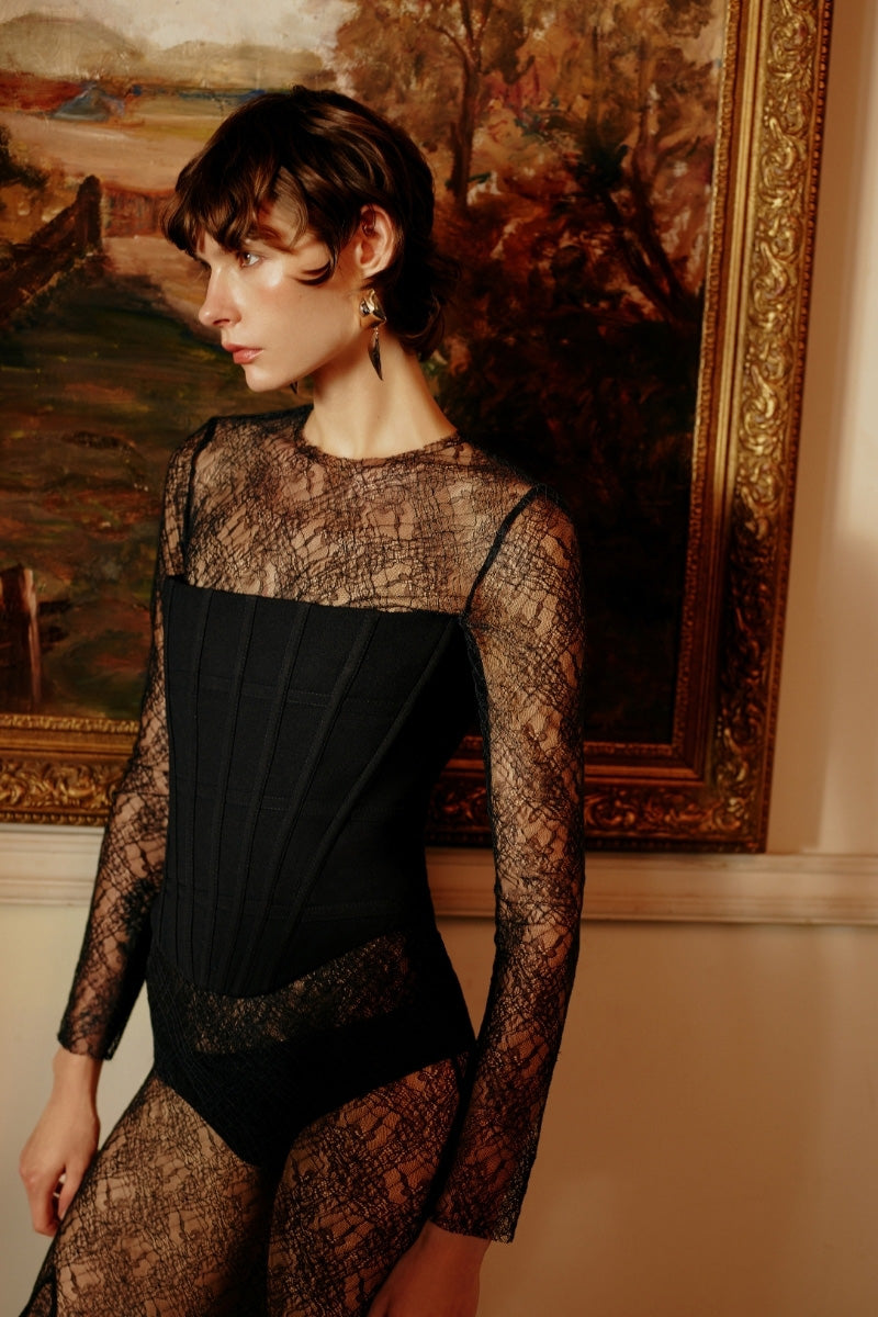 La robe Venice apporte une touche couture mystérieuse, spectaculaire et sophistiquée aux robes de soirée modernes grâce à son corsage en dentelle noire et sa silhouette ornée d'un corset.