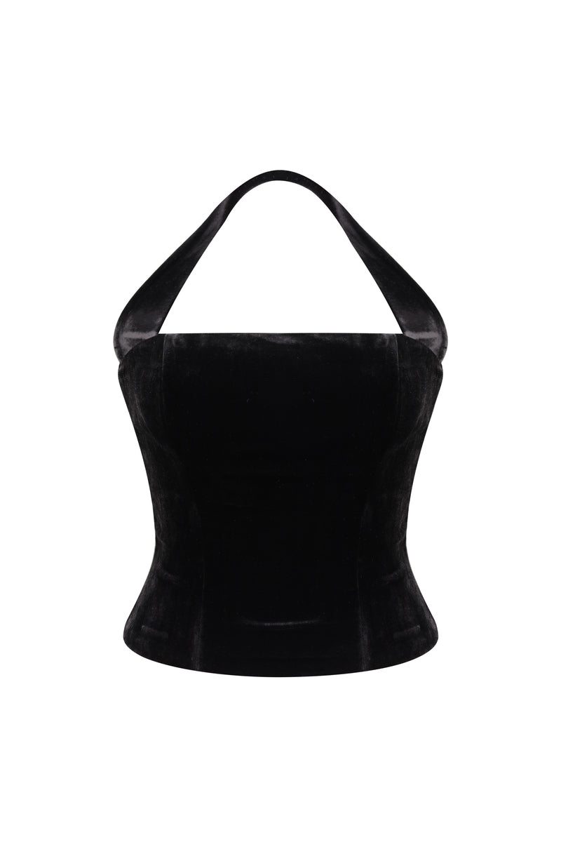 Un corset sculptant en velours extensible et soyeux, offrant une silhouette moulante et un décolleté dos nu. Il est doté d'une armature interne de maintien et d'une fermeture éclair dissimulée dans le dos.