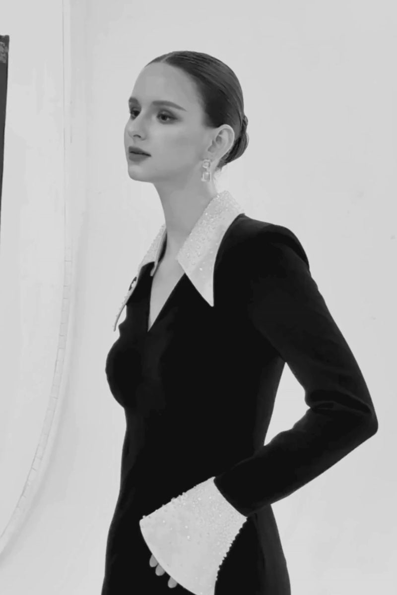 Cette robe moulante sophistiquée respire l'élégance intemporelle grâce à son crêpe noir épuré qui sculpte la silhouette à la perfection. Ses manches évasées et son col pointu, ornés de délicates perles, lui confèrent une touche de charme royal. Mélange harmonieux de minimalisme moderne et de glamour vintage, cette pièce incarne le luxe raffiné.