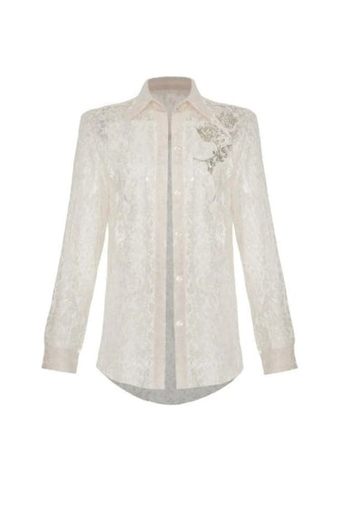 Cet ensemble élégant associe une blouse transparente et texturée à une jupe ivoire structurée et longue pour un look à la fois raffiné et moderne. La blouse arbore un délicat motif jacquard floral, un col classique et un décolleté en V profond, subtilement fermé par une barre métallique, créant une touche d'élégance.