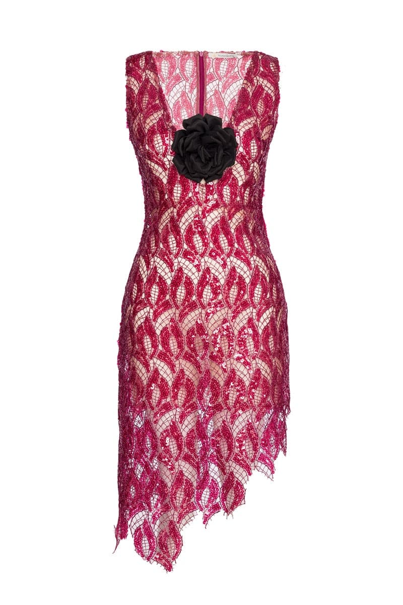 mini-robe asymétrique en dentelle à paillettes avec rose détachable