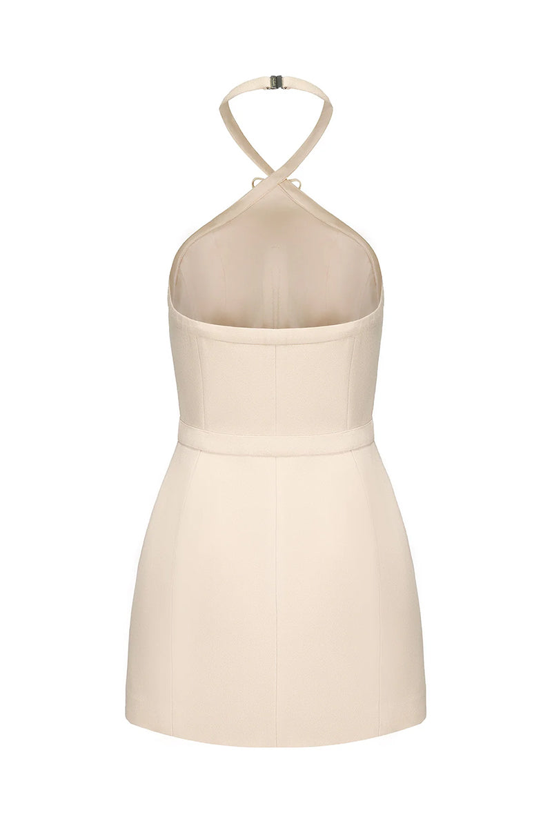 La robe Claira respire l'élégance intemporelle avec son luxueux tissu en acétate de chanvre double épaisseur et son design sophistiqué. Sa coupe dos nu met en valeur le décolleté, tandis que la silhouette en S accentue vos courbes naturelles, créant une coupe flatteuse. Un charmant détail de nœud à l'encolure ajoute une touche féminine, complétée par une élégante boucle à logo argentée pour une fermeture sans effort. La couleur beige rayonne de luxe discret, faisant de cette robe un choix polyvalent pour toute occasion où le style et la grâce sont indispensables.