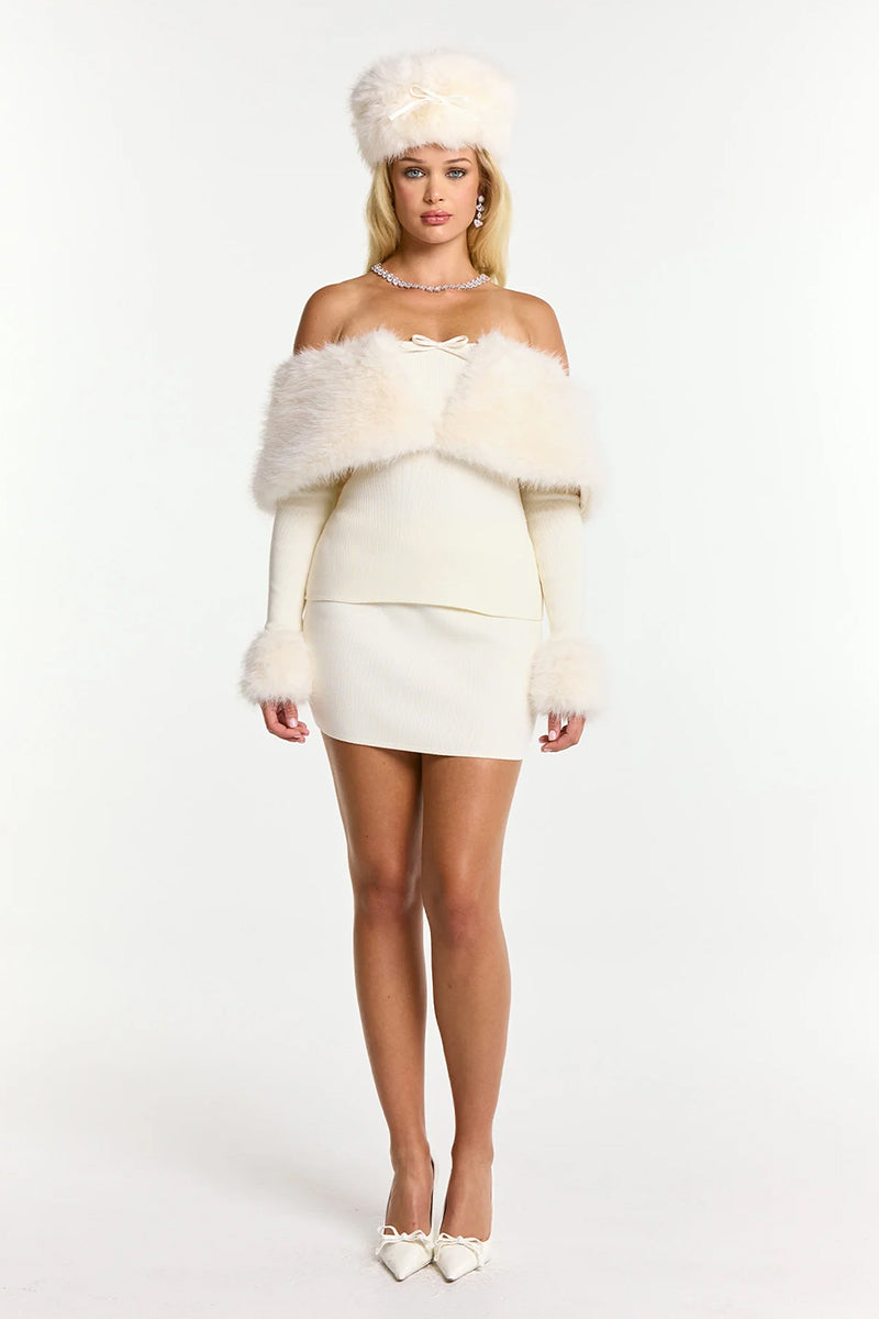 Le haut Nadine est une pièce chic en tricot à une épaule avec un col et des poignets en fourrure moelleuse, confectionnée dans un tissu en tricot doux pour un port confortable. La fourrure écologique de haute qualité ajoute une touche de luxe avec sa texture riche et lisse, créant un look superposé et sophistiqué. La bordure en fourrure amovible permet un nettoyage facile et des options de style polyvalentes. Un nœud en satin sur la poitrine rehausse encore son élégance, ce qui rend ce haut adapté à une variété d'occasions.