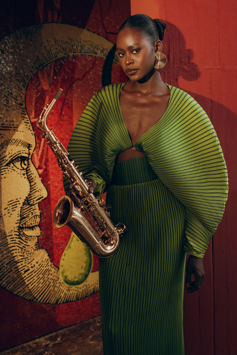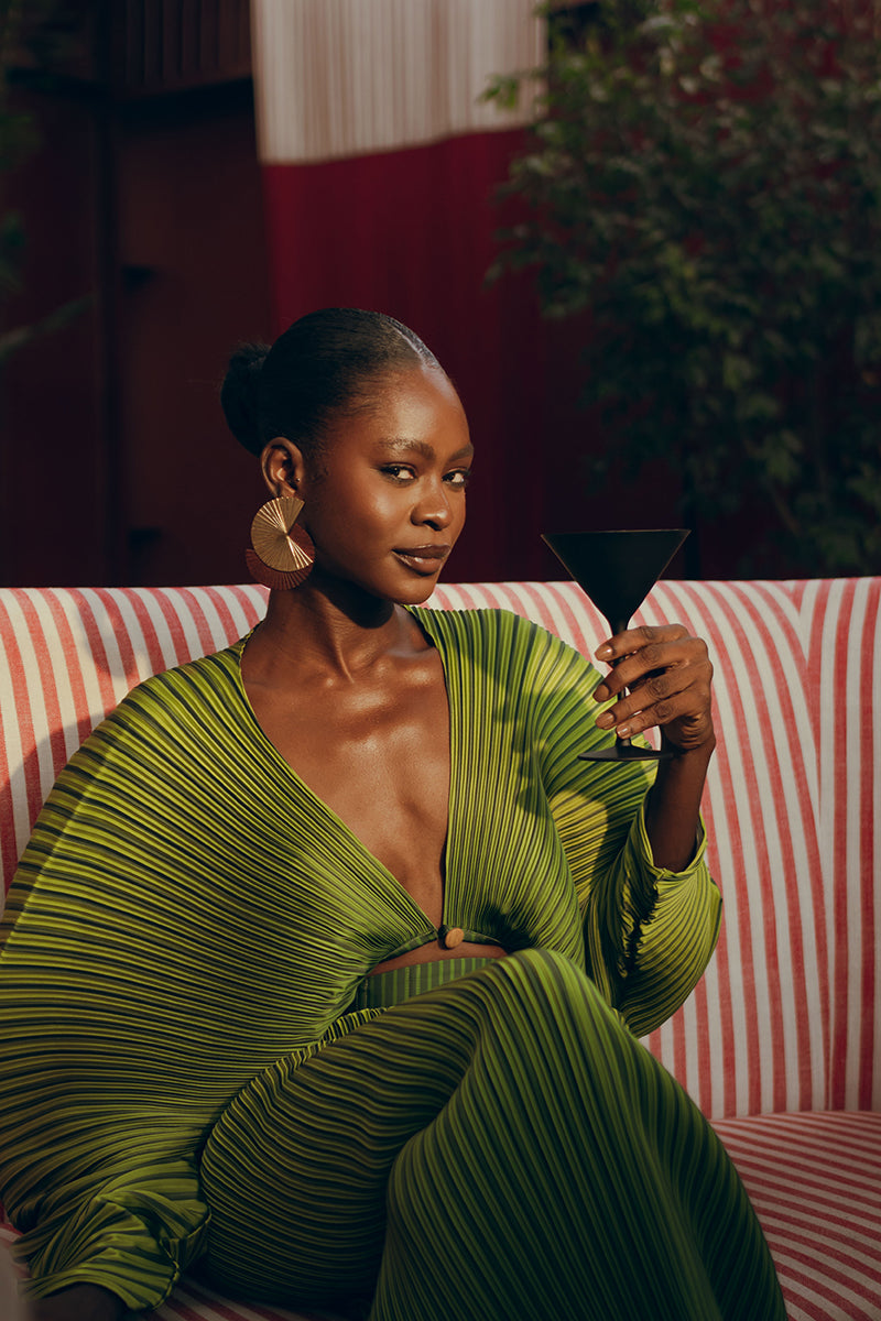 Le crop top BALU est une pièce forte qui emprunte son design à notre modèle phare, le body SOMBRA. Ce top, à la fois simple et élégant, se distingue par son décolleté en V profond, ses manches longues fuselées et ses plis. Son design unique crée une silhouette à la fois aérienne et enveloppante, évoquant une montgolfière. Les plis à fines rayures, associés à un imprimé rayé, lui confèrent une texture souple qui accentue encore son volume.