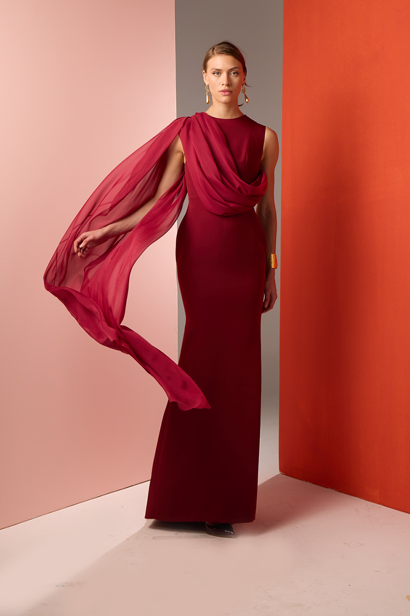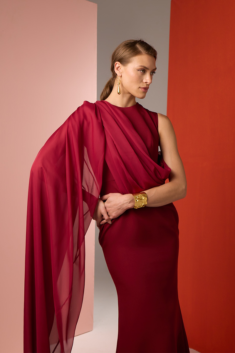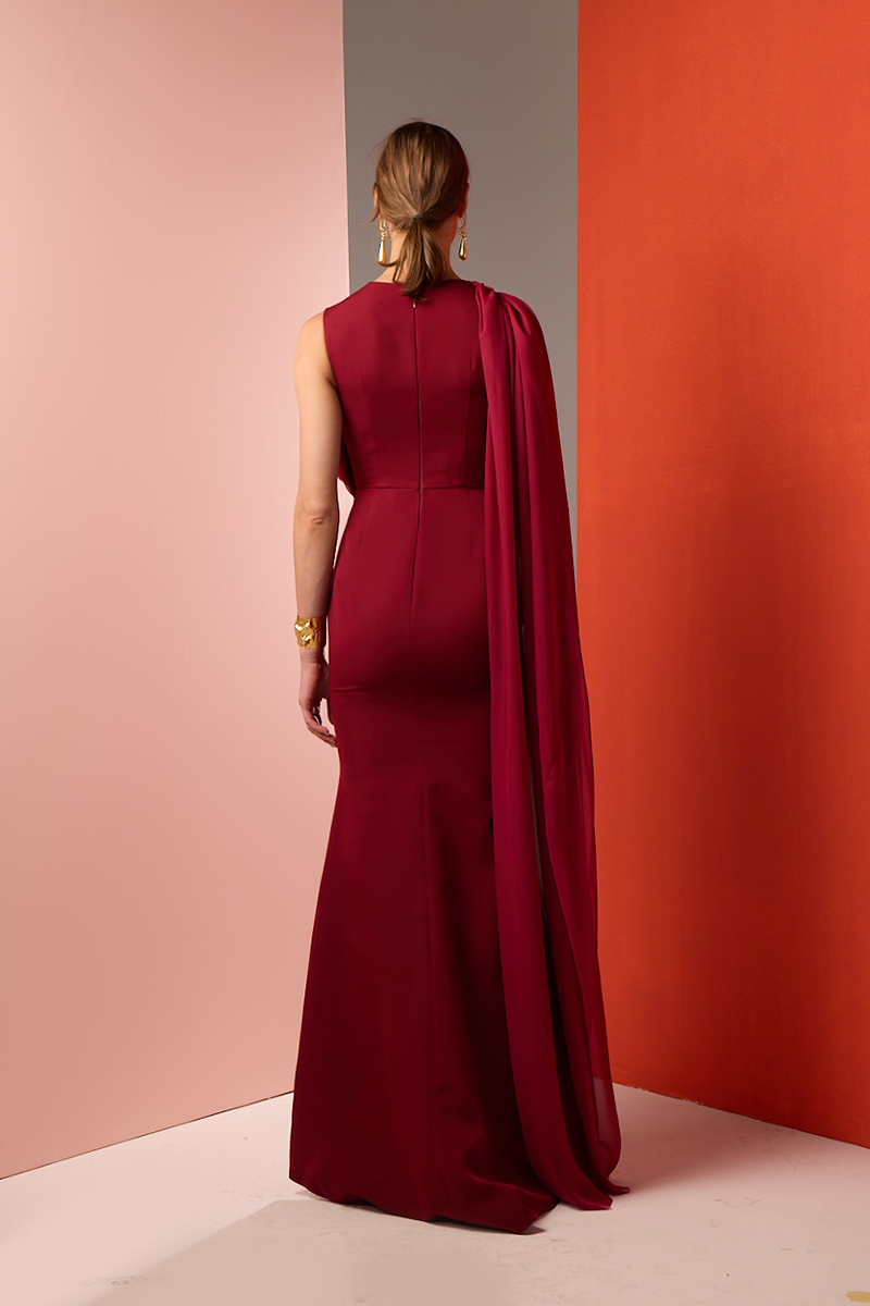 Élégante et raffinée, cette robe longue bordeaux présente une silhouette épurée sans manches, rehaussée d'une cape asymétrique en mousseline. Confectionnée en crêpe luxueux pour un drapé élégant, elle se ferme discrètement au dos par une fermeture invisible pour une finition impeccable. Parfaite pour les soirées et les événements formels.