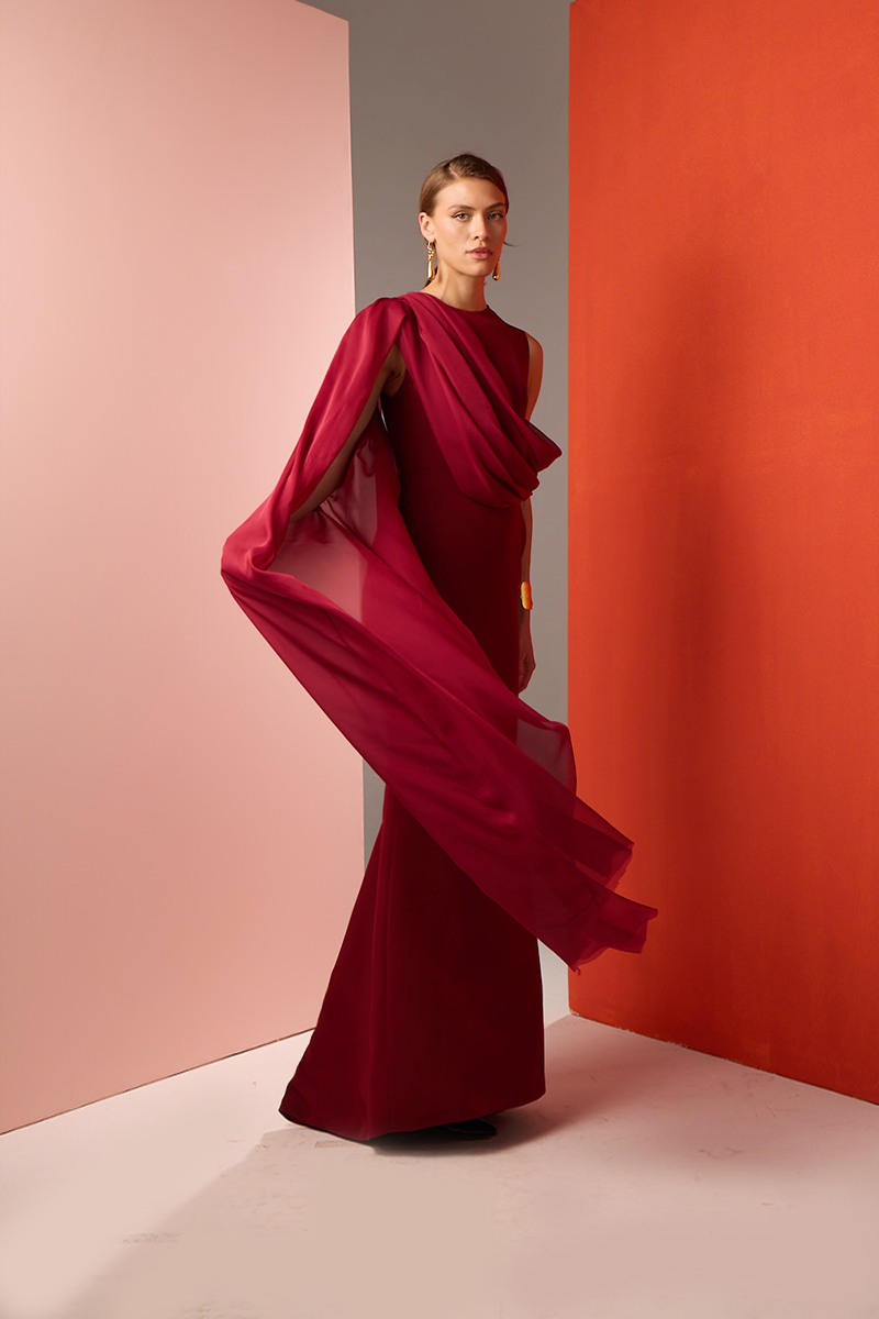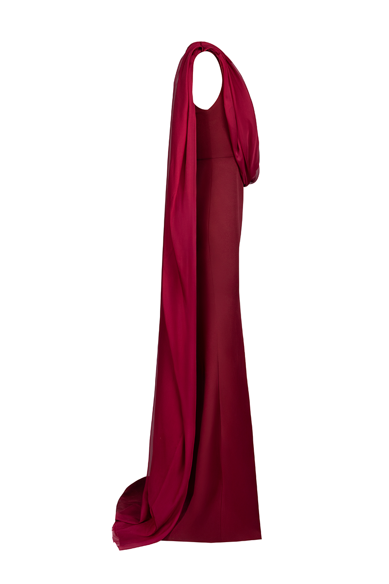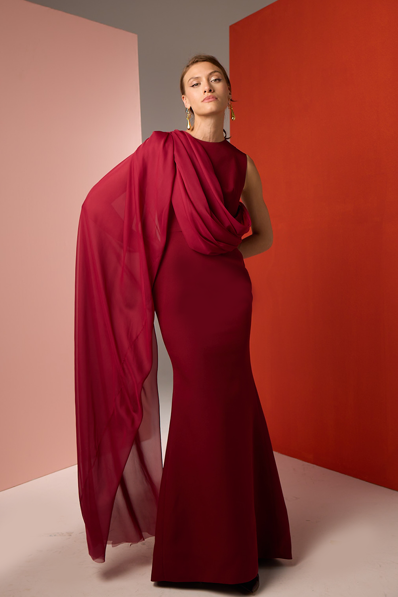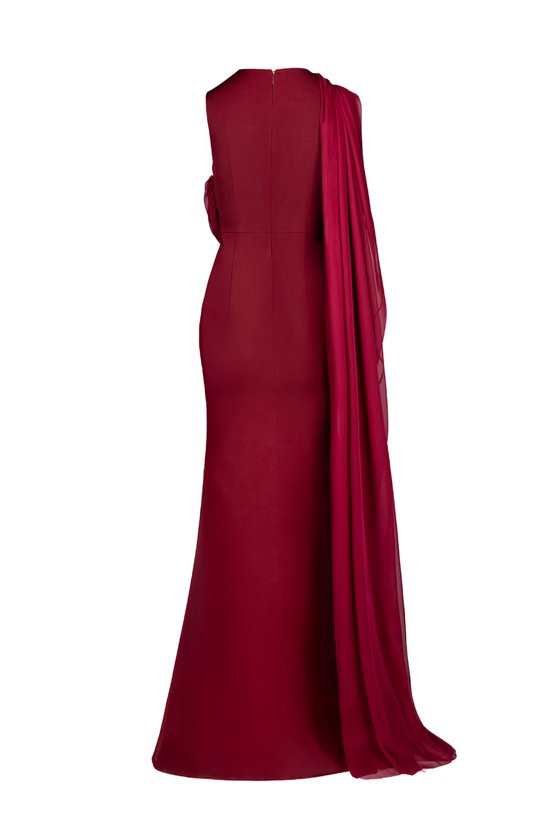 Élégante et raffinée, cette robe longue bordeaux présente une silhouette épurée sans manches, rehaussée d'une cape asymétrique en mousseline. Confectionnée en crêpe luxueux pour un drapé élégant, elle se ferme discrètement au dos par une fermeture invisible pour une finition impeccable. Parfaite pour les soirées et les événements formels.
