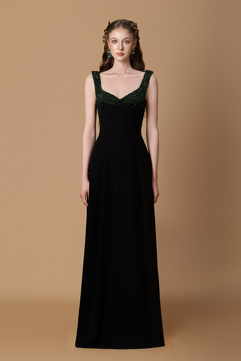 Ode à l'élégance intemporelle, cette robe en crêpe de Chine exhale un luxe discret. Sa coupe trapèze épouse gracieusement la silhouette, tandis que les ornements de cristal sur les fines bretelles et les bonnets ajoutent une touche de modernité et de raffinement. Parfaite pour les soirées où se mêlent sophistication discrète et assurance rayonnante.
