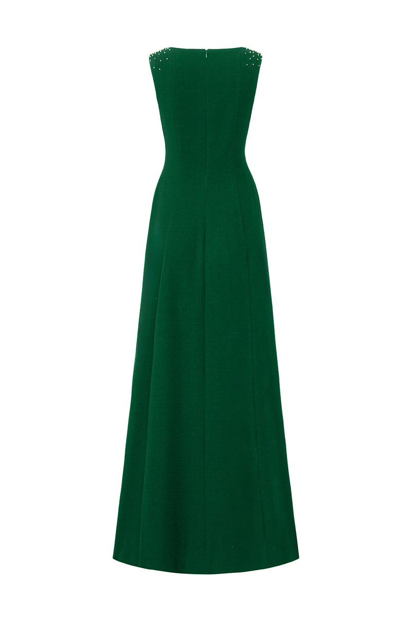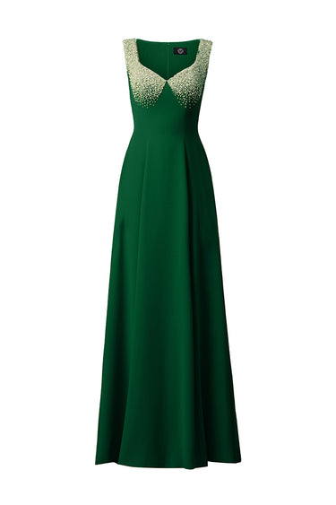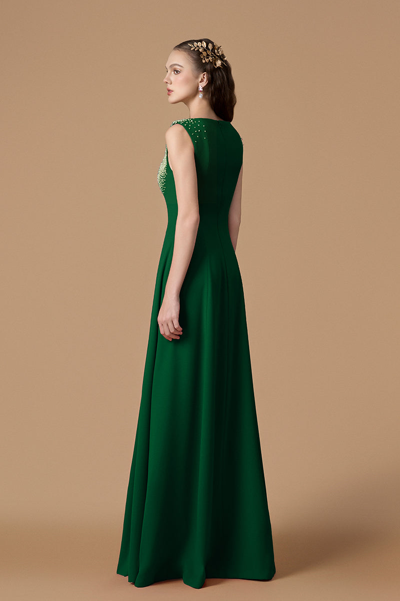 Hommage à l'élégance intemporelle, cette robe en crêpe de Chine exhale un luxe discret. Sa coupe trapèze épouse gracieusement la silhouette, tandis que les ornements de cristal sur les fines bretelles et les bonnets ajoutent une touche d'opulence moderne. Parfaite pour les soirées où se mêlent sophistication discrète et assurance rayonnante.