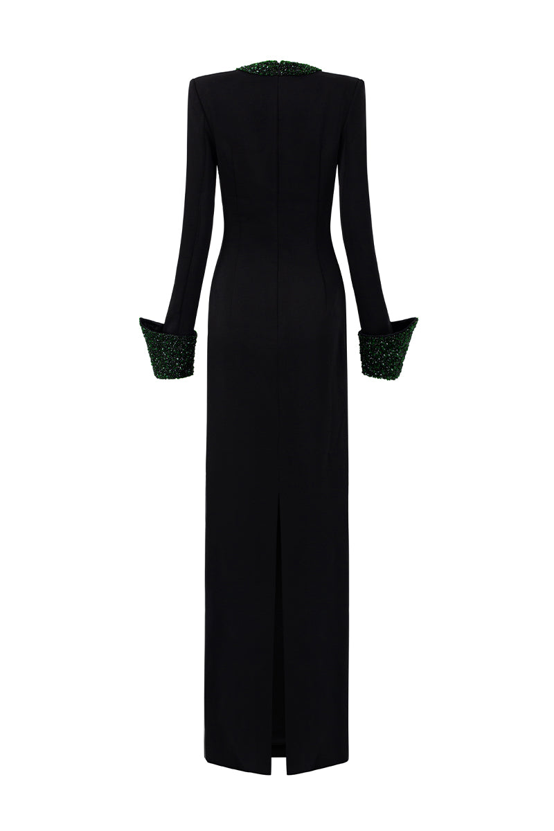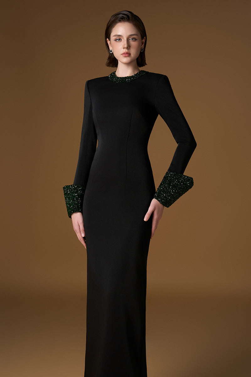 La robe colonne en crêpe incarne un luxe discret et une puissance raffinée. Conçue avec une encolure ronde et des manches longues, elle épouse les formes avec une précision impeccable. De subtiles parures de pierres et de cristaux ornent l'encolure et les revers des poignets, apportant une touche d'éclat à la silhouette noire intemporelle – une vision d'élégance moderne et de grâce classique.
