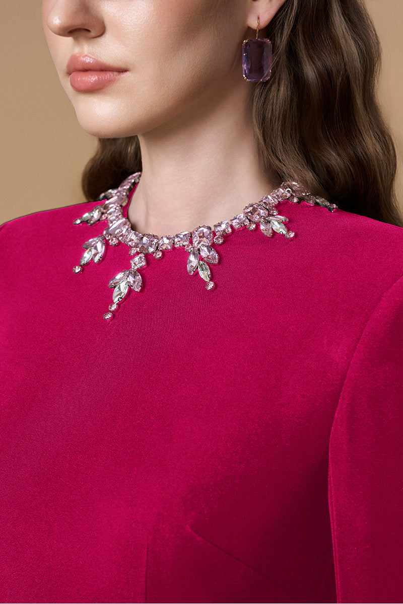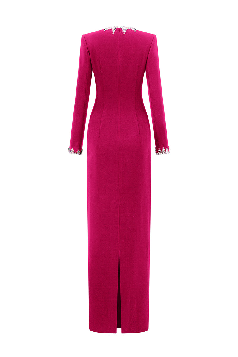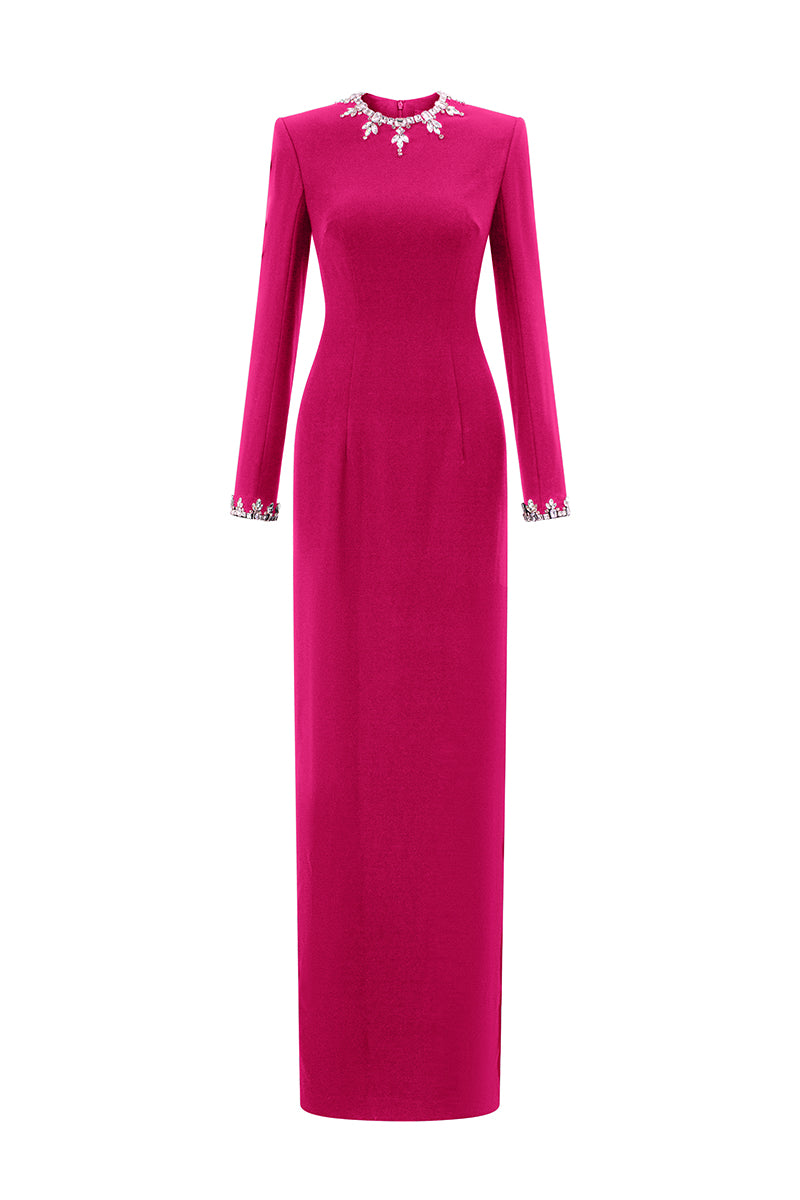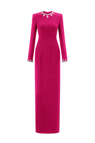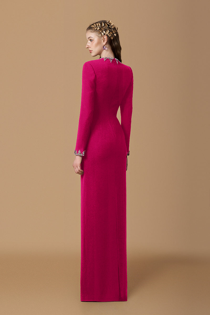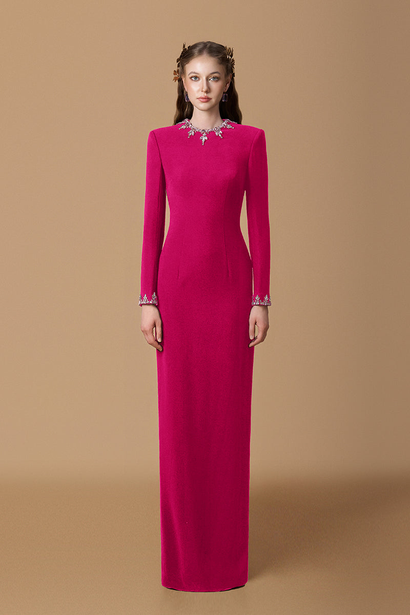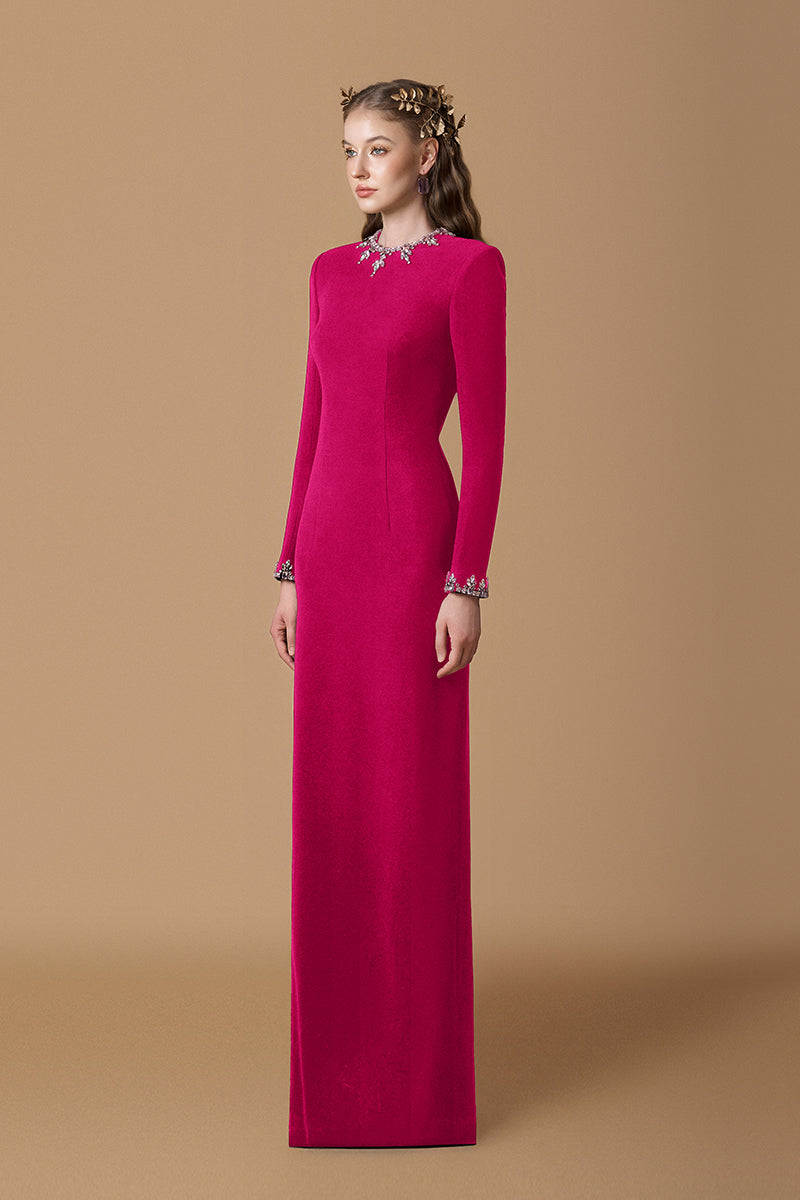 Cette robe fourreau en crêpe de Chine dégage un luxe discret grâce à son encolure ronde raffinée et ses manches longues. De subtiles et saisissantes parures de pierres ornent l'encolure et les poignets, apportant une touche d'éclat sophistiquée et sublimant la silhouette intemporelle de la robe. Une pièce parfaite qui allie la grâce classique de la haute couture à un minimalisme moderne.