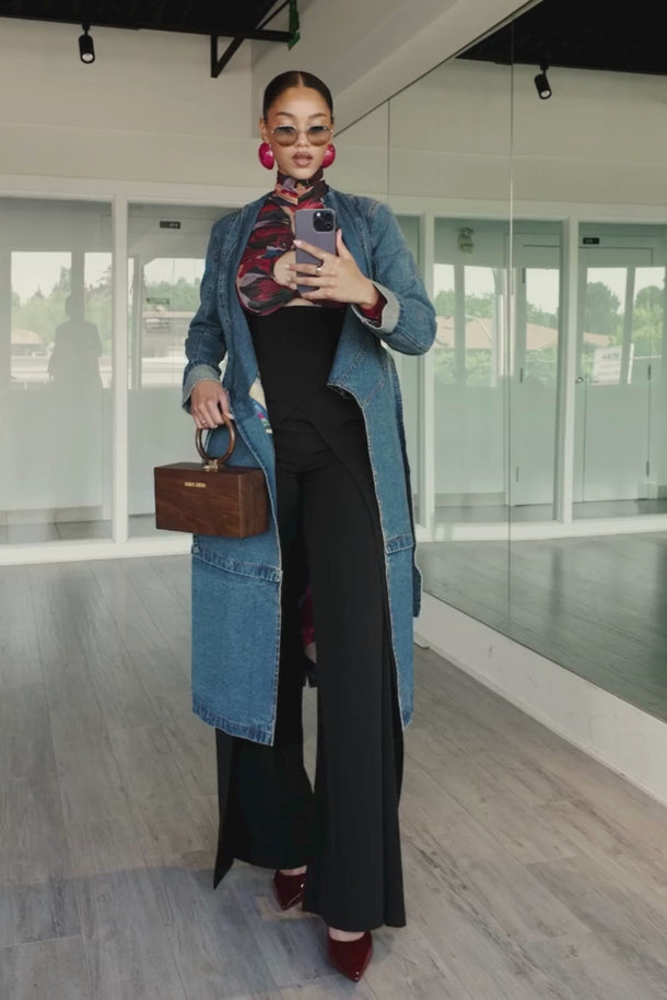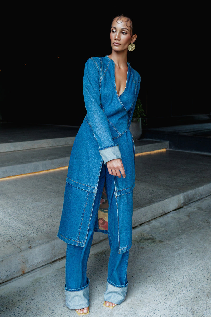 Confectionnée en denim haut de gamme, cette pièce mi-mollet présente un col montant structuré et une coupe portefeuille fonctionnelle. Elle se ferme à la taille grâce à une ceinture extérieure à boucle en D et un lien intérieur pour un ajustement impeccable.