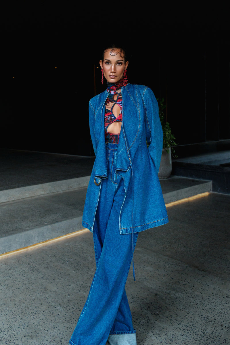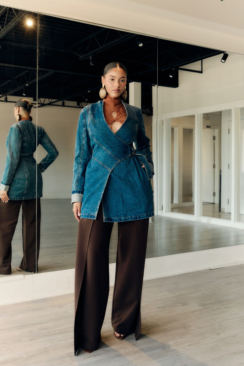 La veste en jean Curva est la toute première veste d'ANDREA IYAMAH. C'est un manteau affirmé qui allie avec brio polyvalence et design moderne.