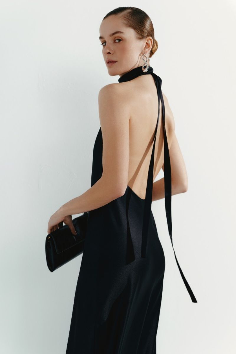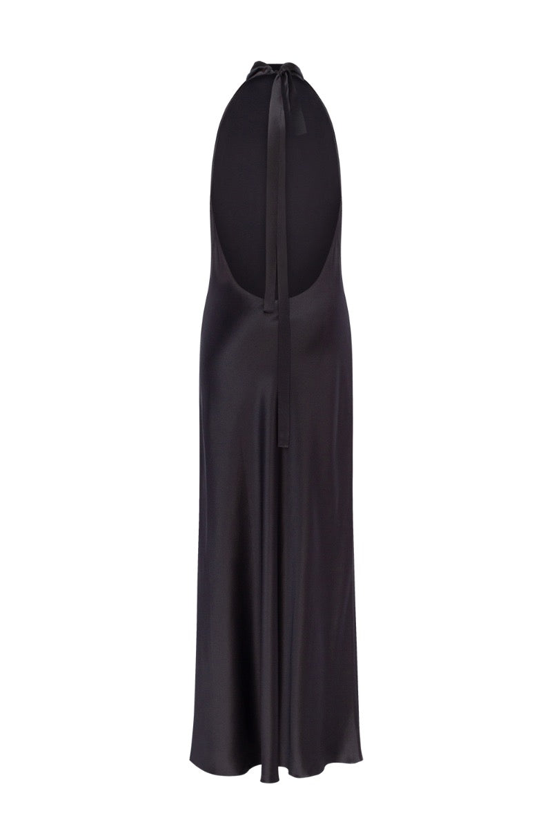 The Deniz dress exudes timeless sophistication, crafted from natural silk satin for a luxurious feel. Featuring a ’90s-inspired high cowl neckline and a seductively low open back, it offers a chic and contemporary style. The figure-hugging silhouette is complemented by adjustable neck ties for a perfect, custom fit. Ideal for special occasions or as a wedding guest outfit, this silk gown pairs elegantly with minimalist gold jewelry and strappy heels.