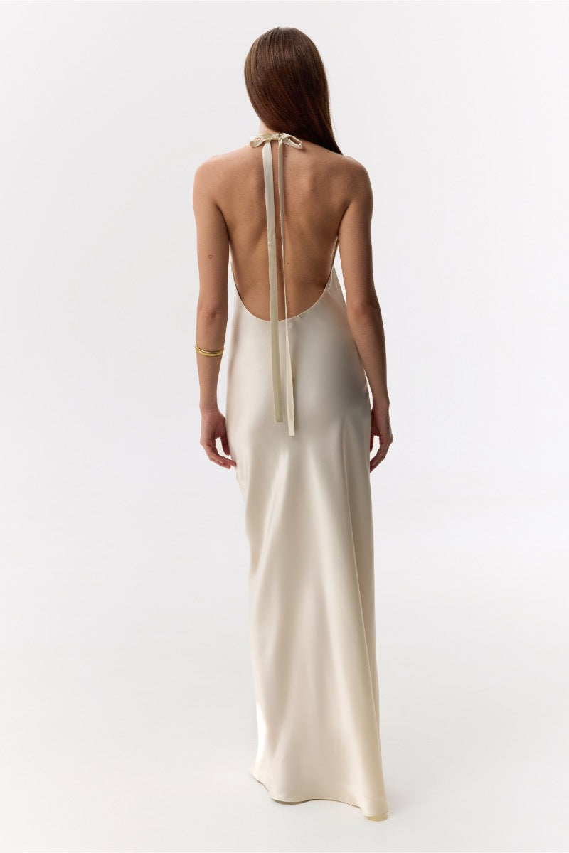 The Deniz dress exudes timeless sophistication, crafted from heavy double-faced natural silk satin for a luxurious feel. Featuring a ’90s-inspired high cowl neckline and a seductively low open back, it offers a chic and contemporary style. The figure-hugging silhouette is complemented by adjustable neck ties for a perfect, custom fit. Ideal for special occasions or as a wedding guest outfit, this silk gown pairs elegantly with minimalist gold jewelry and strappy heels.